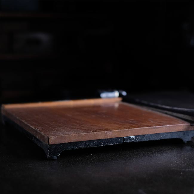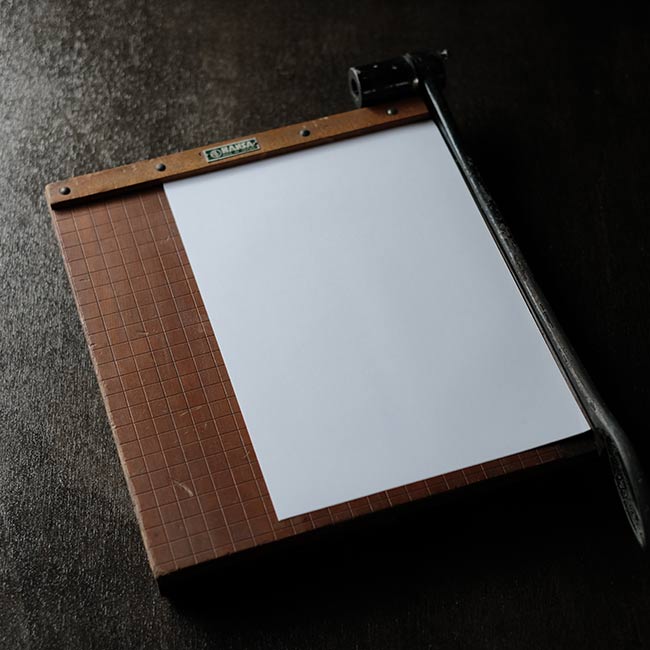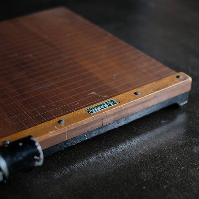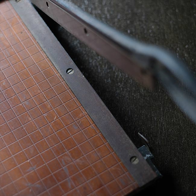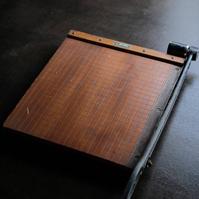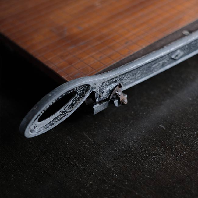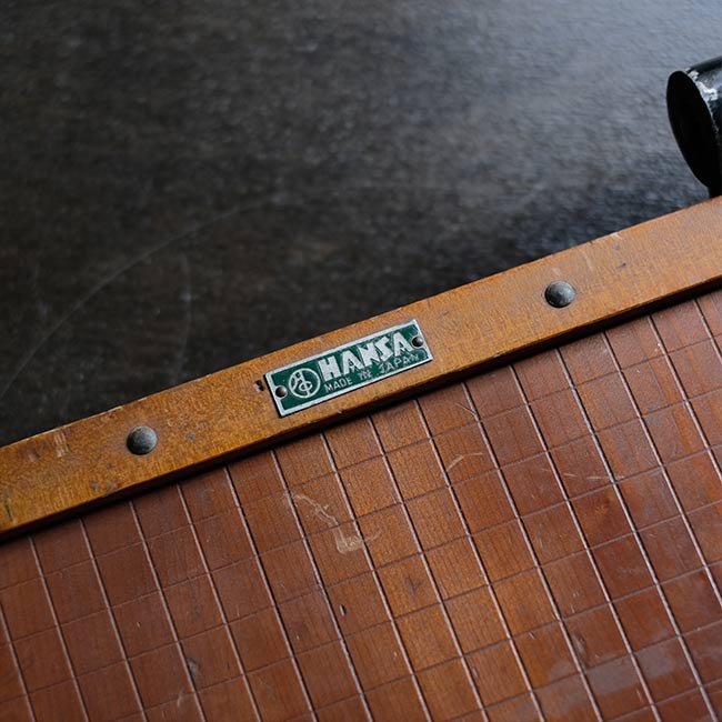 カメラ用品のHANSAなのかどうかがわかりませんでしたが、マイナスネジが使われた古い裁断機になります。厚みのないシュッとしたデザインですが、珍しくアルミの台座が付属しています(裁断機は通常ゴム脚です)。