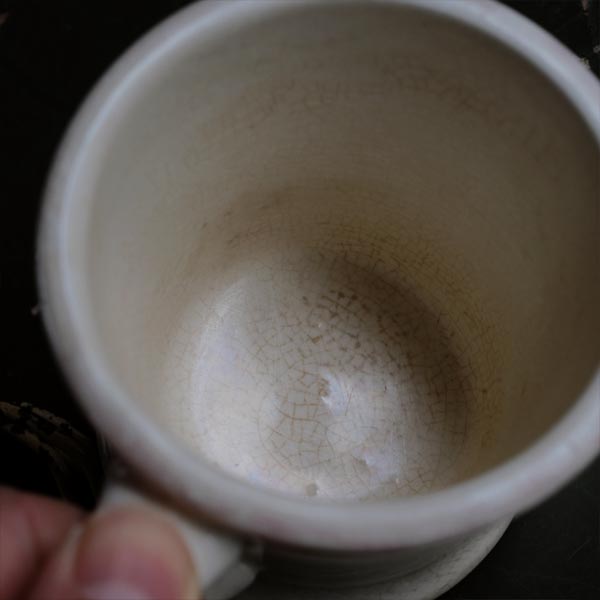コンディションを見てみますと、貫入が全体に入っていて、そこにところどころシミが加わります。また口縁には口紅のあとと思われる紫色の淡いシミが見受けられますが、キズは全体的に少なく、とても大切に扱われてきたことがわかります。