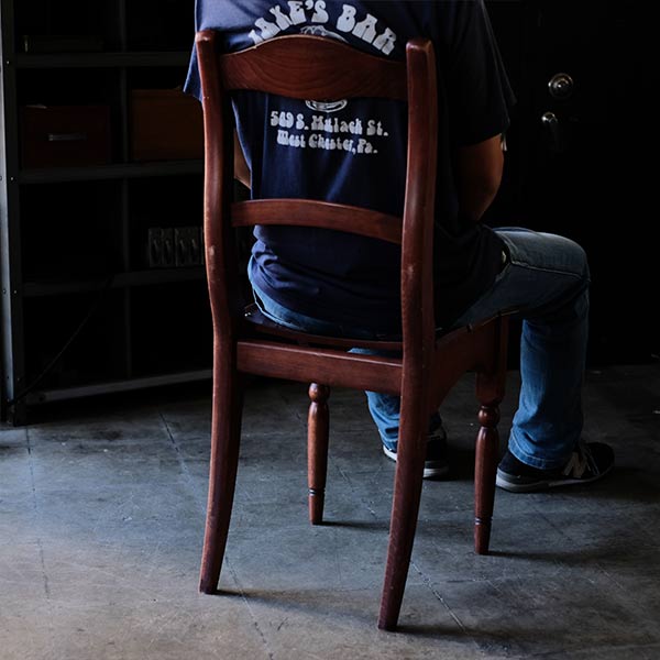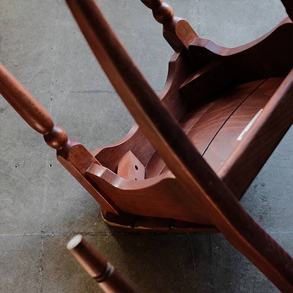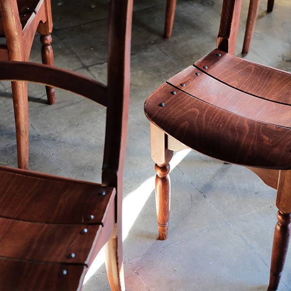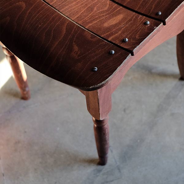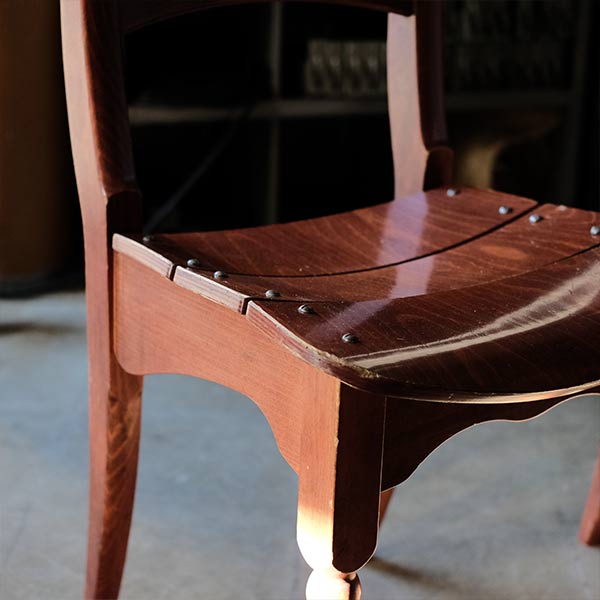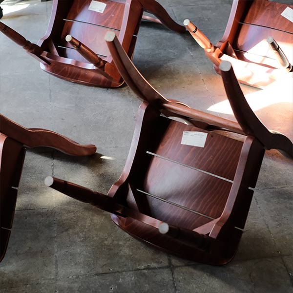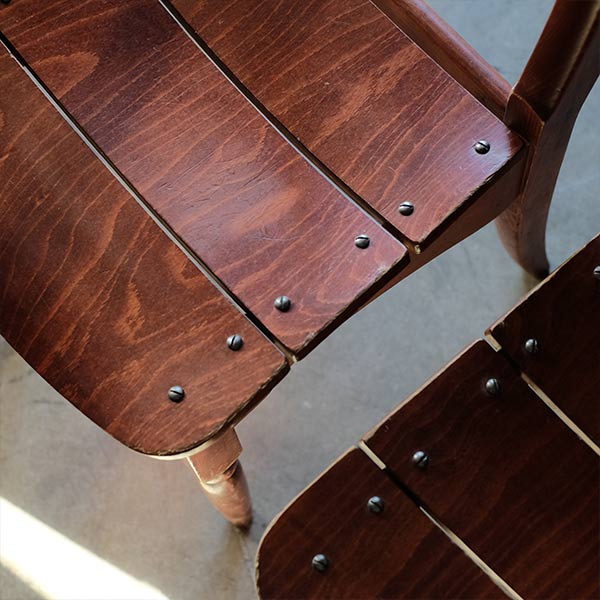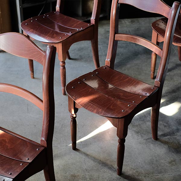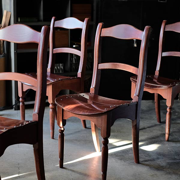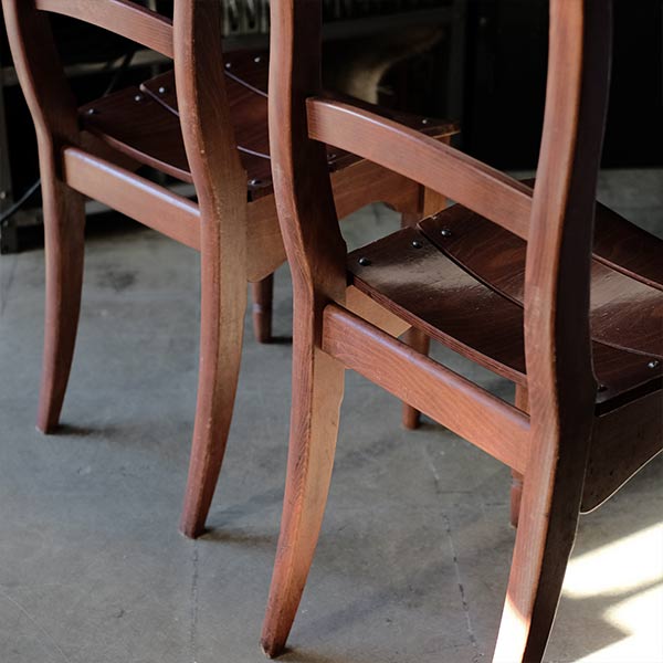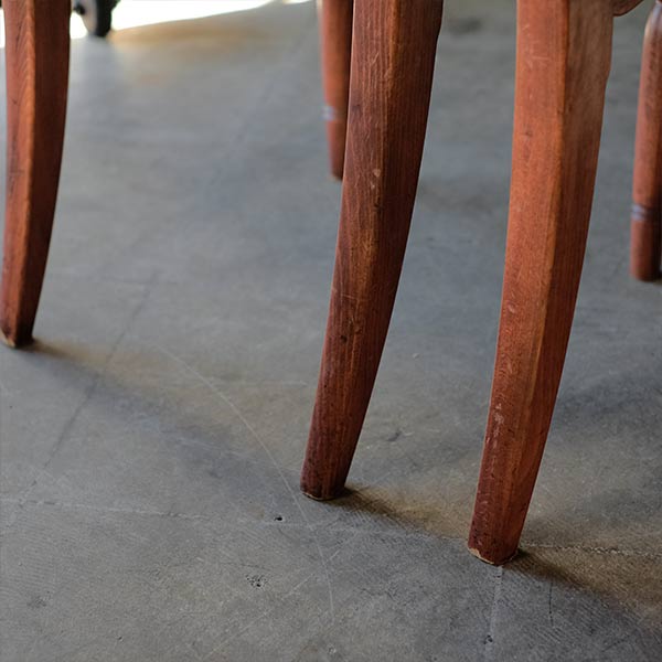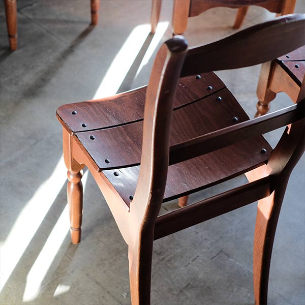 実際に使われていた椅子になりますので、傷や凹み、黒ずみ、ペイントの剥がれといった、表面的なダメージは見られます。そのため、思い切った価格設定としましたが、ぐらつきはなく、使用に支障のあるレベルのダメージもありません。