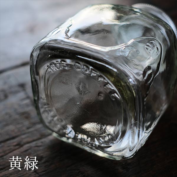 容器本体の製造はOwens-Illinois Glass Company。在庫は、ガラスの色味が淡い黄緑と淡いピンクの2点ありますので、ご注文の際にご希望をお選び下さい。
