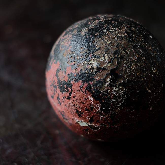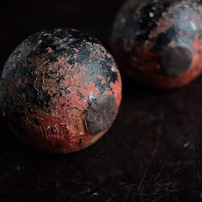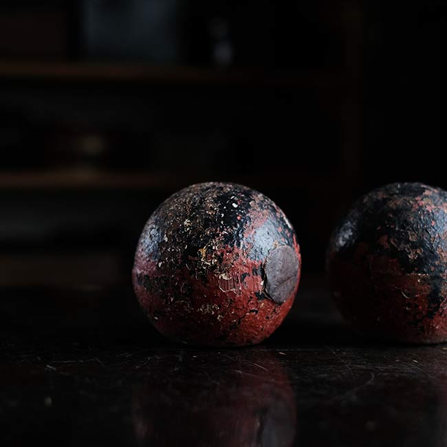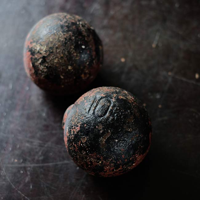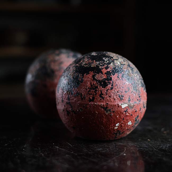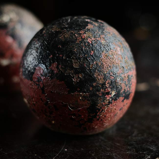 鉄球は下にくる部分を平らにしてあるので、ある程度安定しています。オブジェとして、ブックエンドとして。ペイントの剥がれの他、サビも少し見受けられますことをご了承下さい。2個セットでの販売となります。
