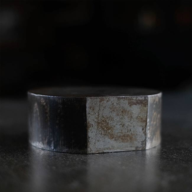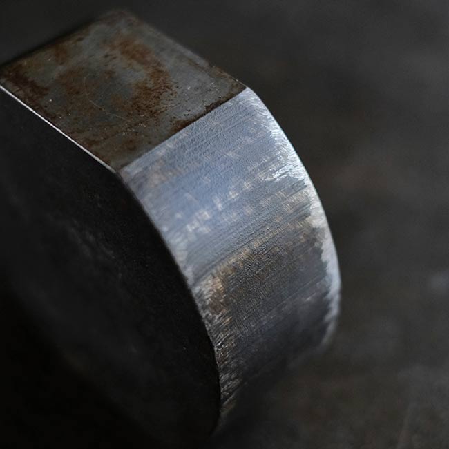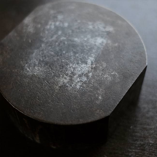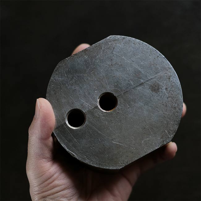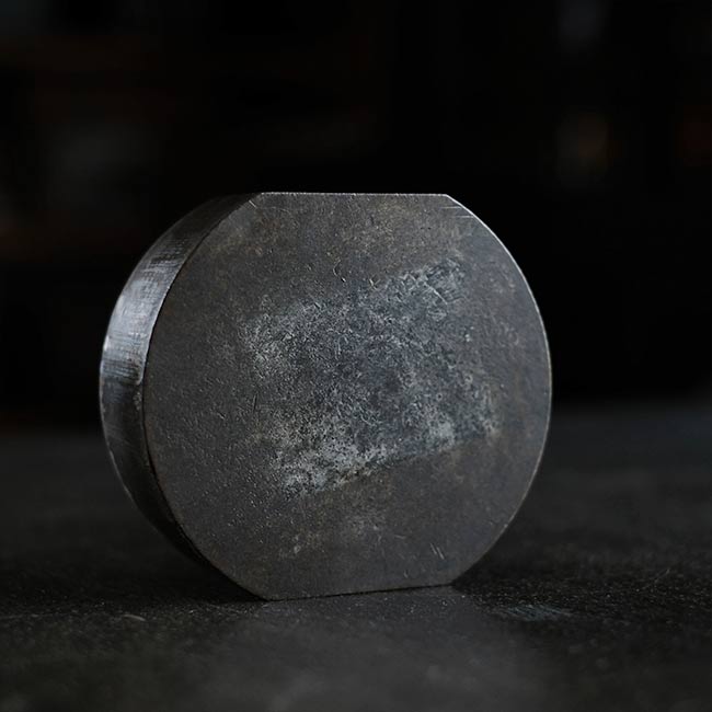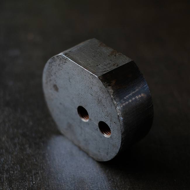 何かの工作機器の土台などに使われていたものと想像します。円の上下をカットしたような形の鉄の塊になります。