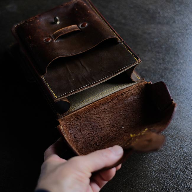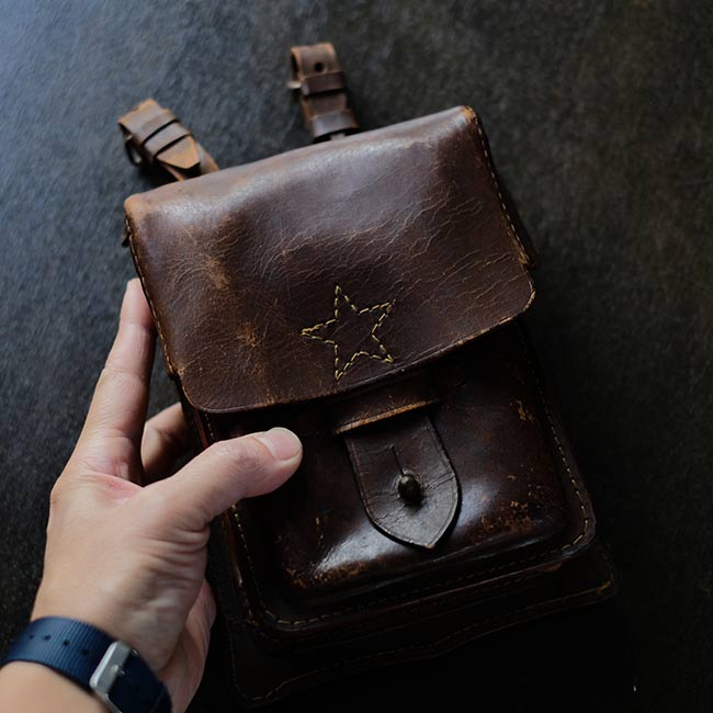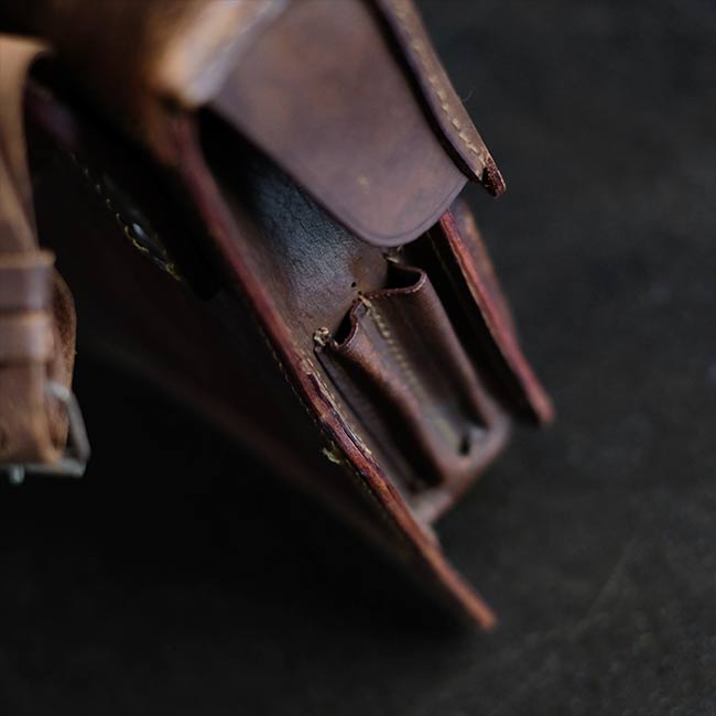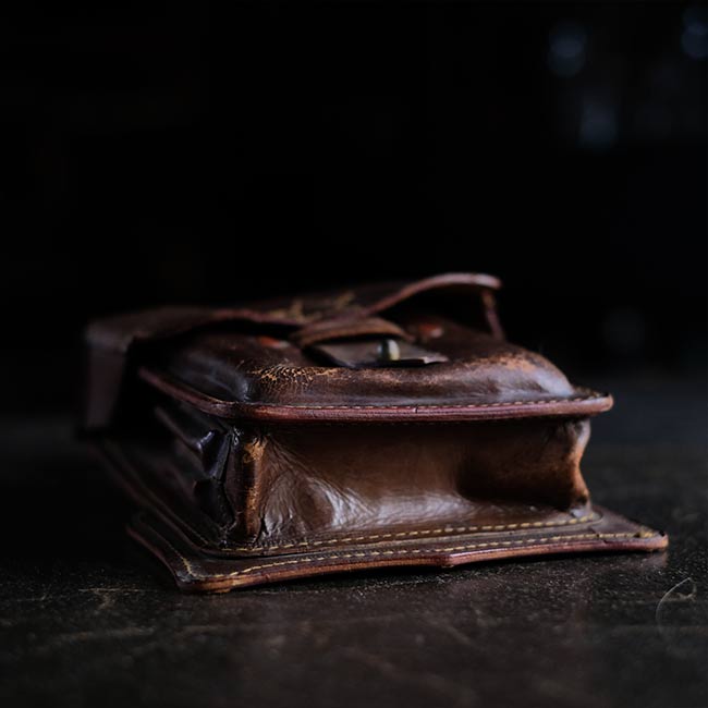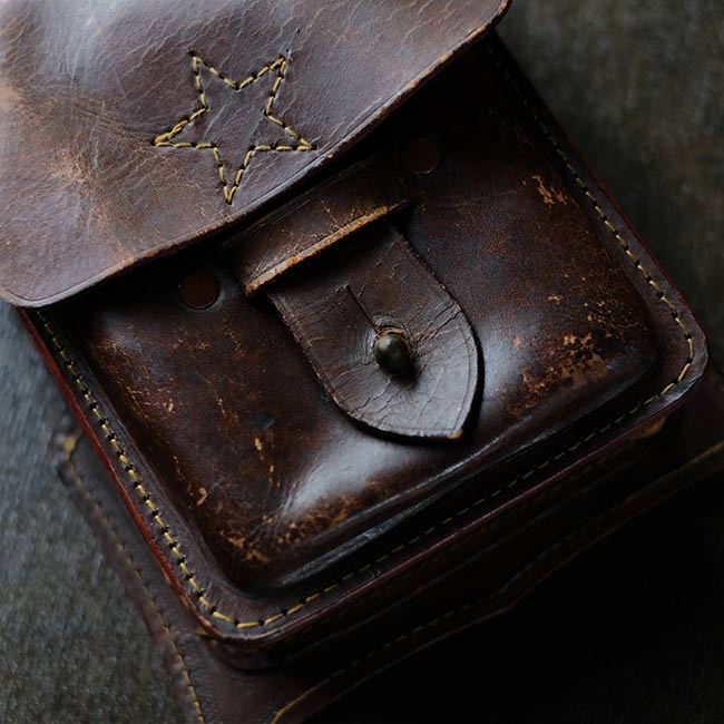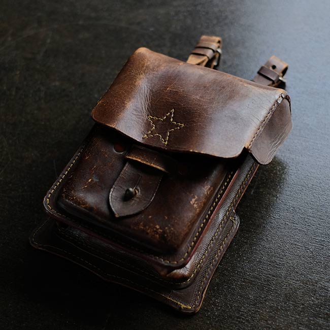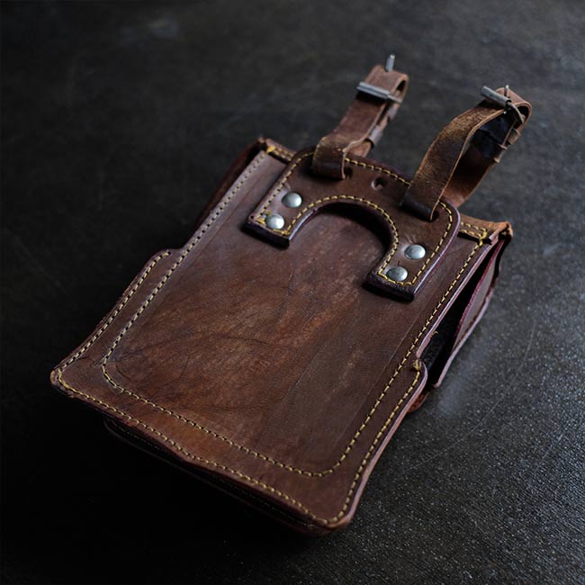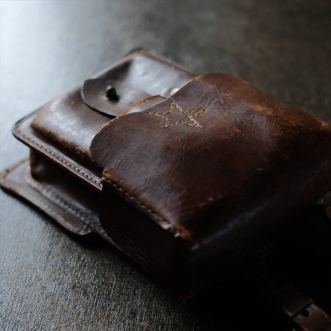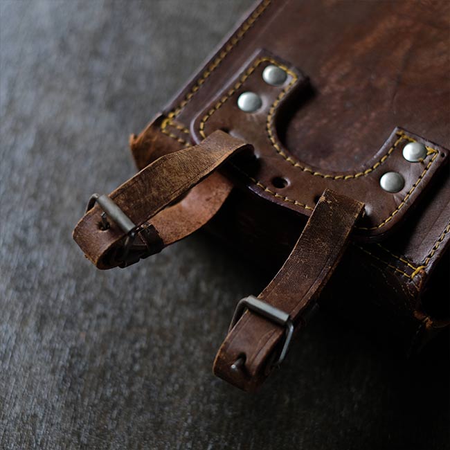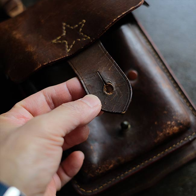 図嚢(ずのう)と呼ばれる、地図を入れておくためのレザーケースになります。日本軍の将校に配られていたもので、ベルトに通せるようループが2本付属。このループは取り外すこともできます。
