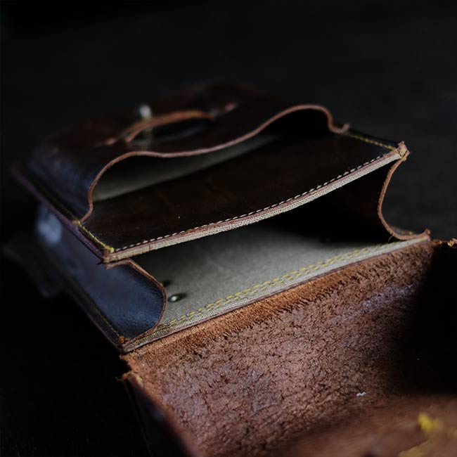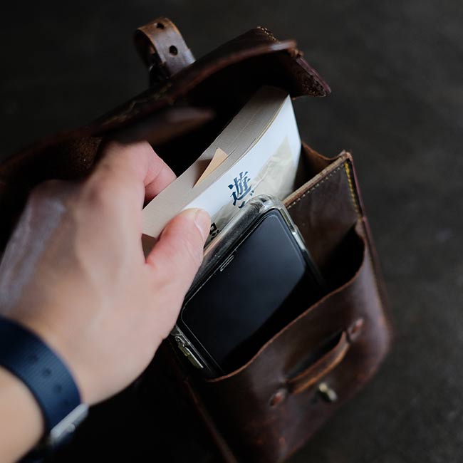 内部はポケットは2つで、底側と仕切りは布張り。大きい方は文庫本がゆとりをもって収まるくらいのサイズ感です。自転車に取り付けてもよし、ショルダーをこしらえてポシェットにしてもいいかもしれません。