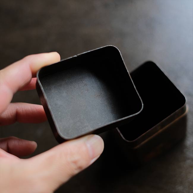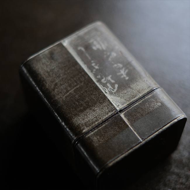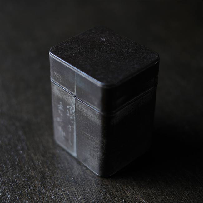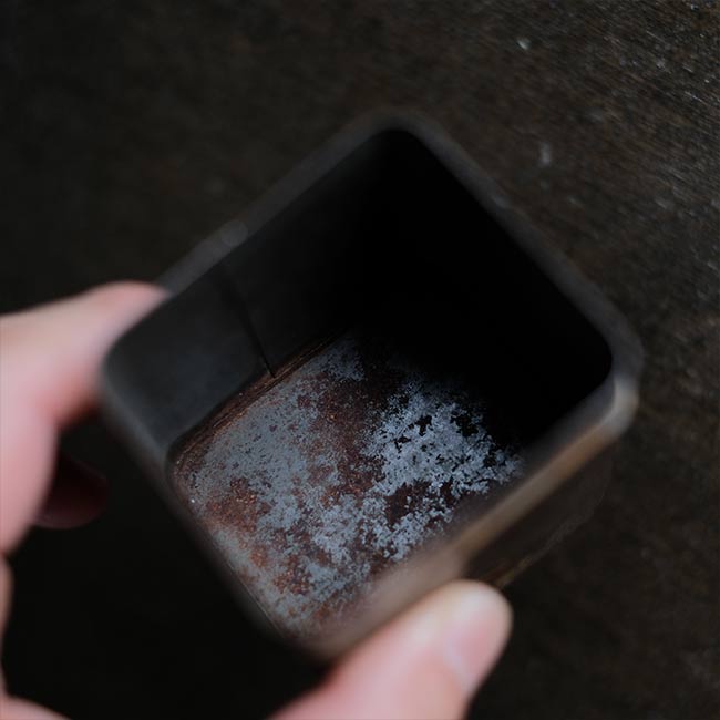 全身まんべんなくくすんで、底や内底には赤サビも見られますが、汚らしい感じではありません。ペン立てにしたり、灰皿にしたり、もちろんそのまま飾っていただいても。