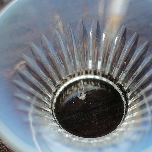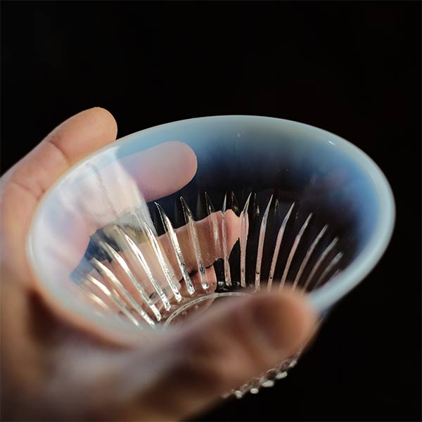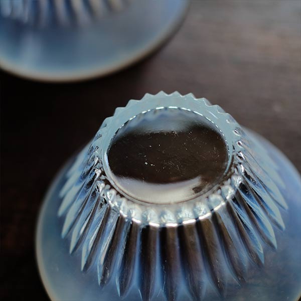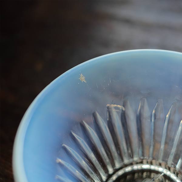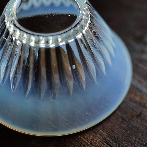 乳白ぼかしの入った氷コップです。ガラスにはシワや多少気泡も含まれていて、味のある質感。ガラス面にはあたりや底に小さな欠けはあるものの、実用レベルのコンディションをキープしています。