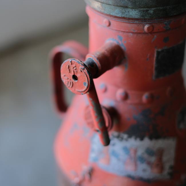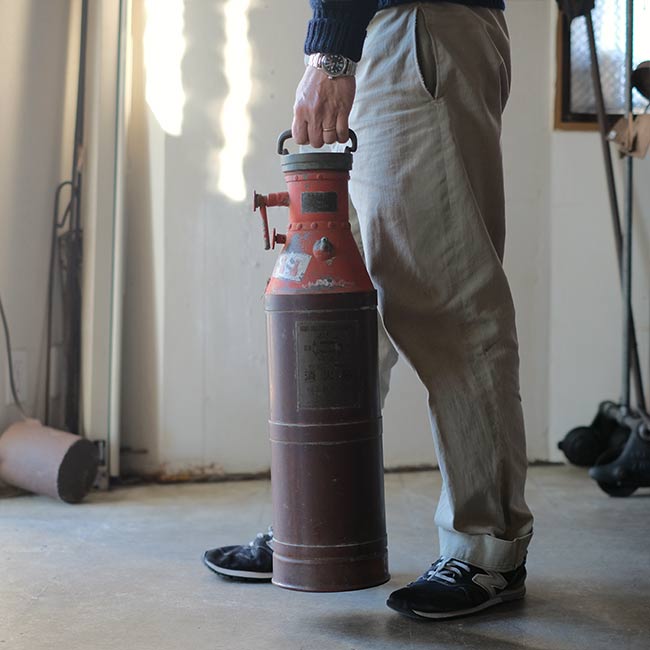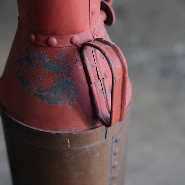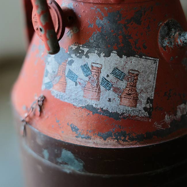 朱色の部分はおそらくもっと濃い赤だったかと思うのですが、それくらい古い消火器になります。プレートには「1955」と打ってあるので、1955年製で間違いないでしょう。