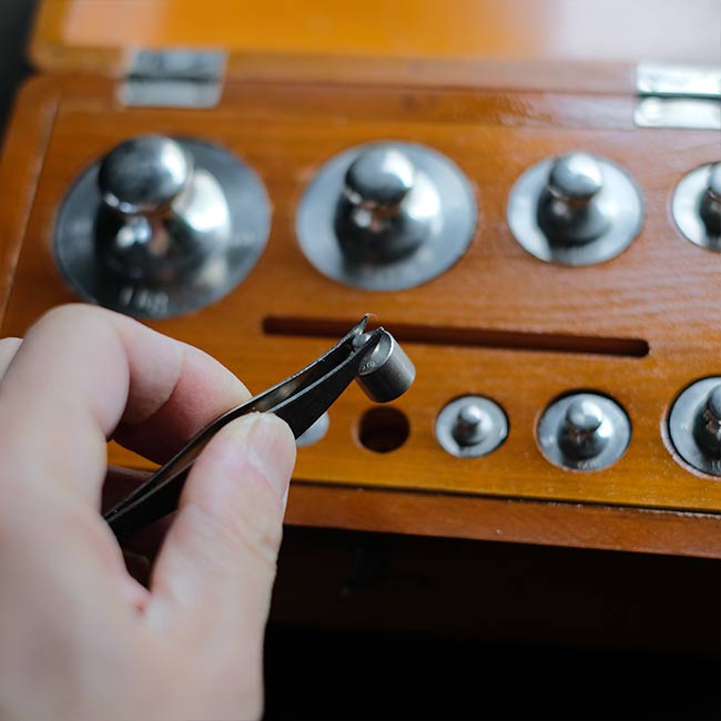 大きめの分銅のセットになります。分銅は1g、2g、2g、5g、10g,10g、20g、50g、100g、100g、200g、500g、1kgの合計13個。さらにピンセットが付属しております。