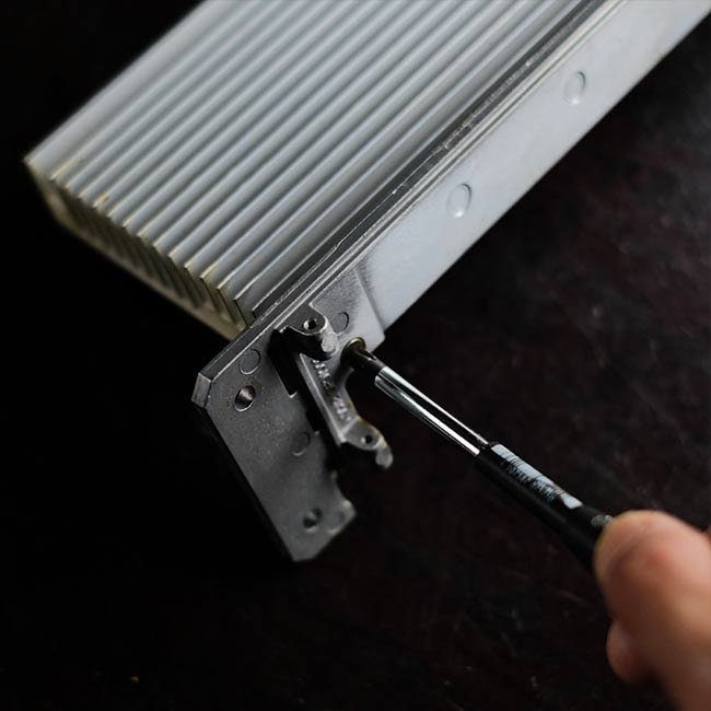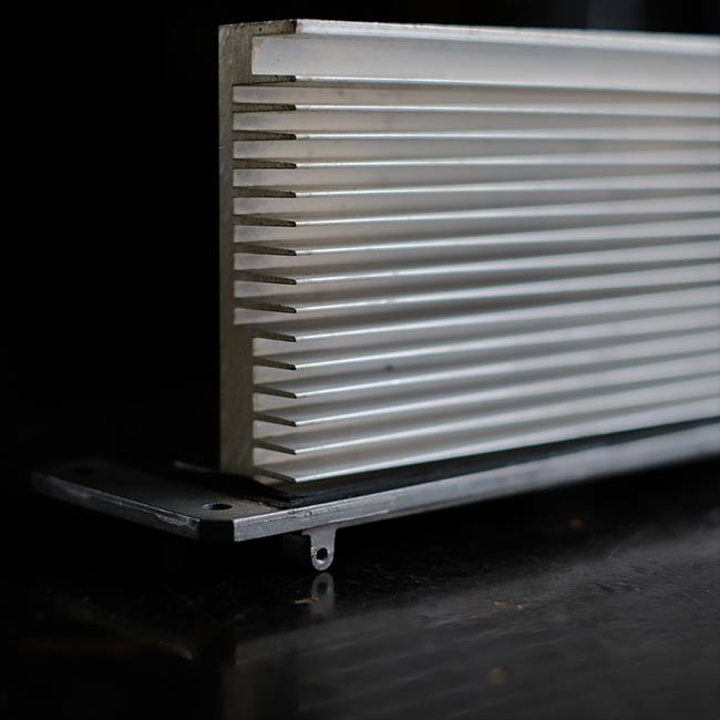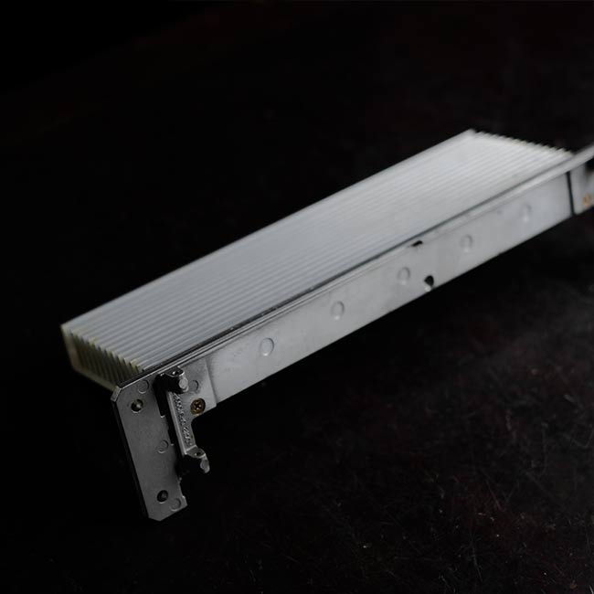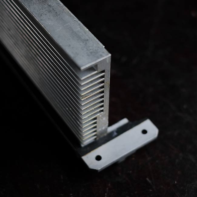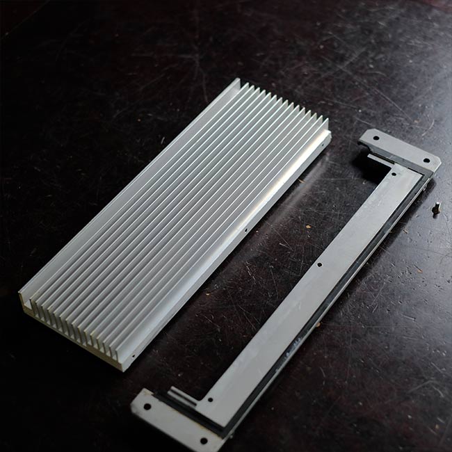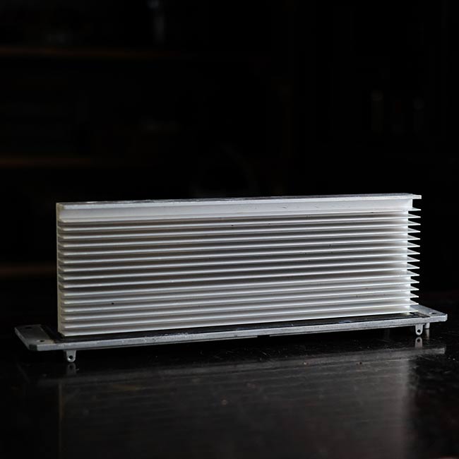 画像検索しても出てこなかったのですが、同業者さんからヒートシンクと教えていただきました。素材はアルミで、幅が35cmほどありますので、そこそこ大きな装置に付いていたものと想像します。