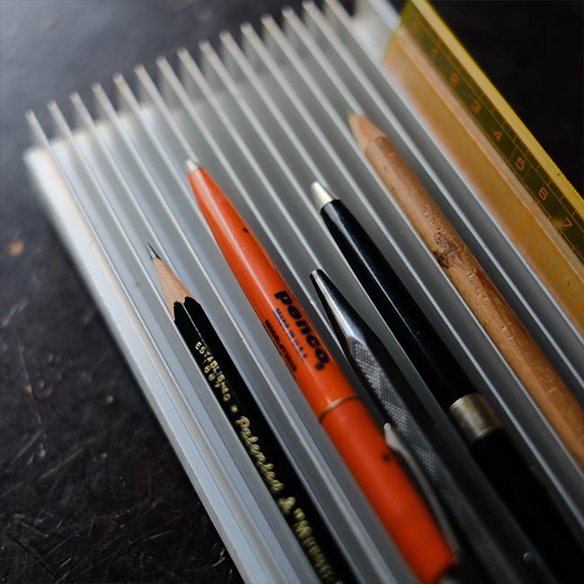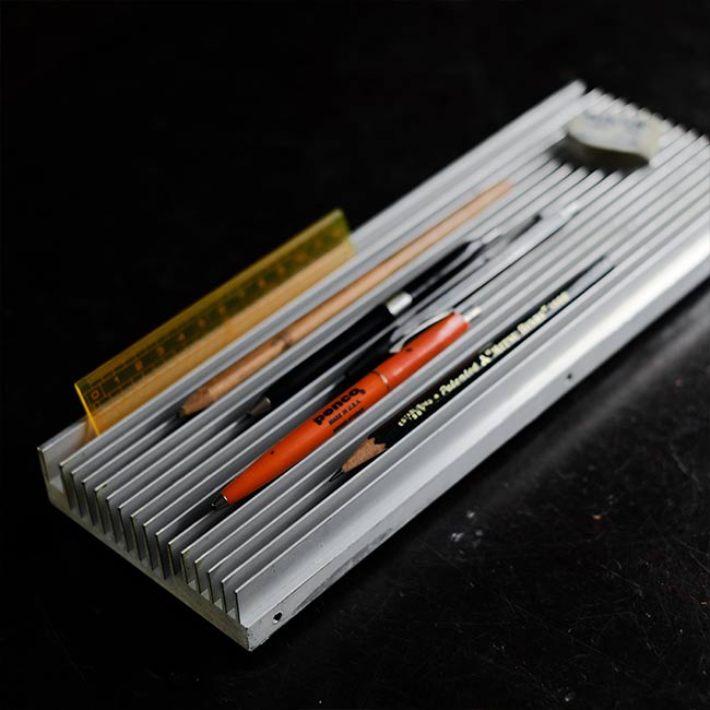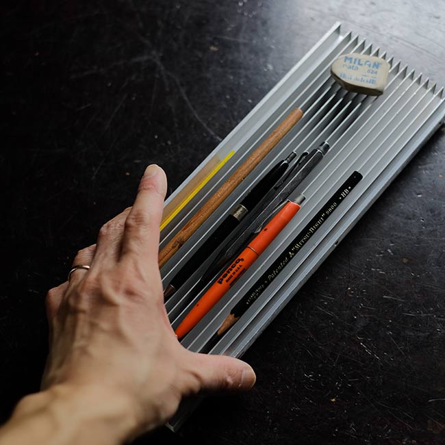 オブジェとしても面白いのですが、ネジを回して台座を外し、本体を寝かせると、グッドデザインなペントレイ兼カードスタンドになります。アクセサリーや小物を並べてみてもいいかもしれません。