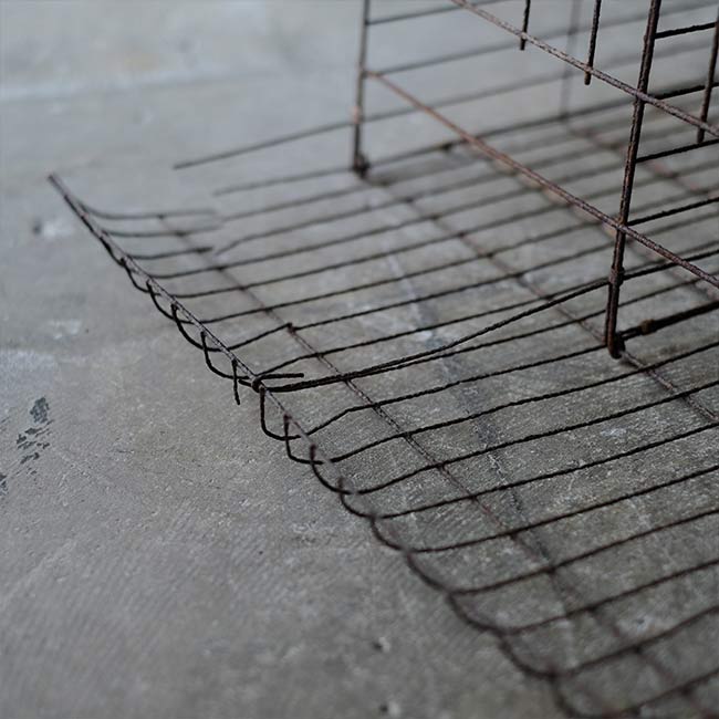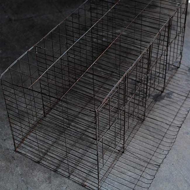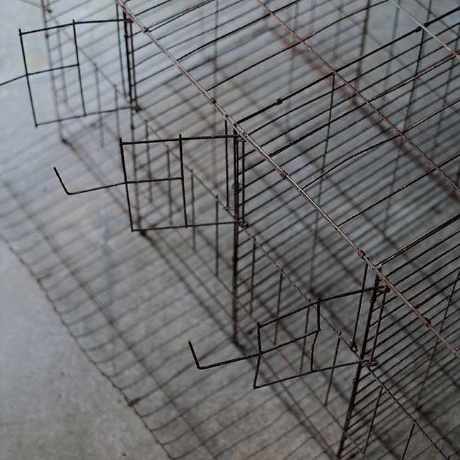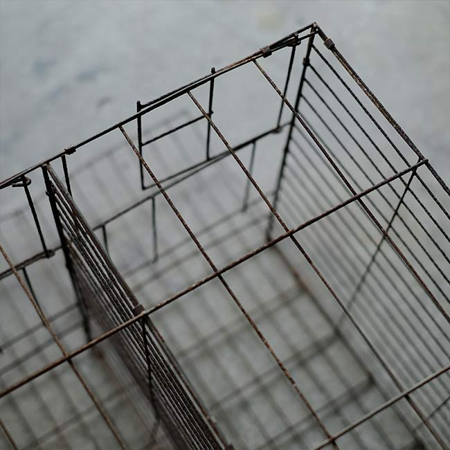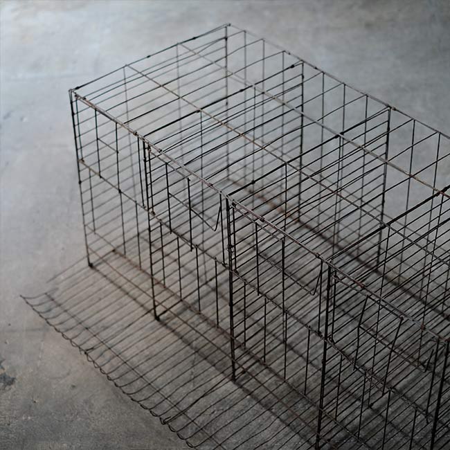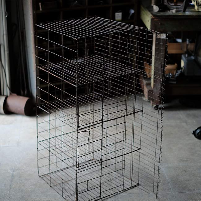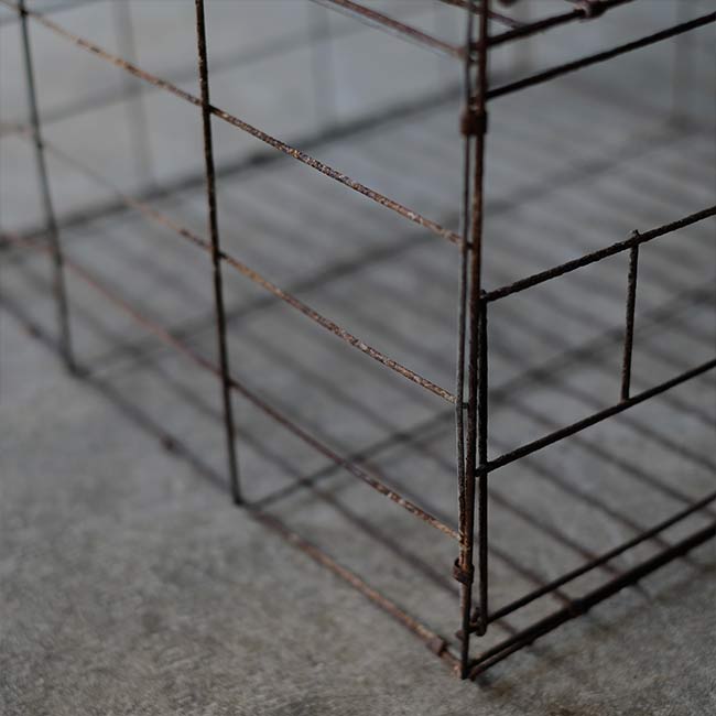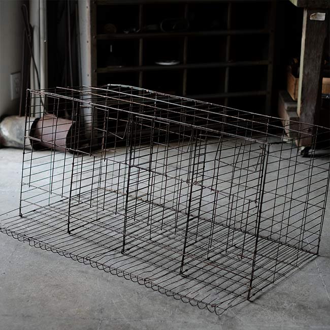 細めのワイヤーで作られた古いニワトリのケージ。手前の下に伸びている部分は、産み落とされた卵の受け皿で、内部は仕切りがついて4部屋という仕様になっています。