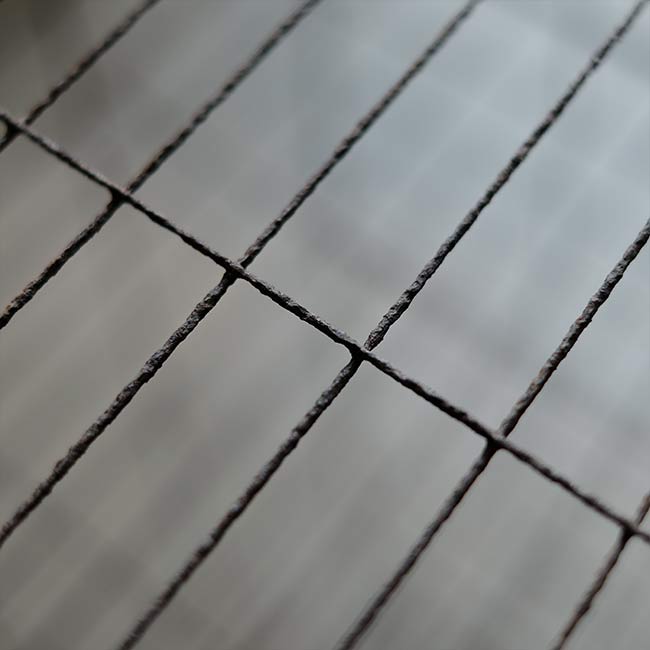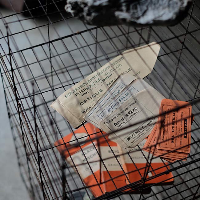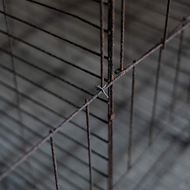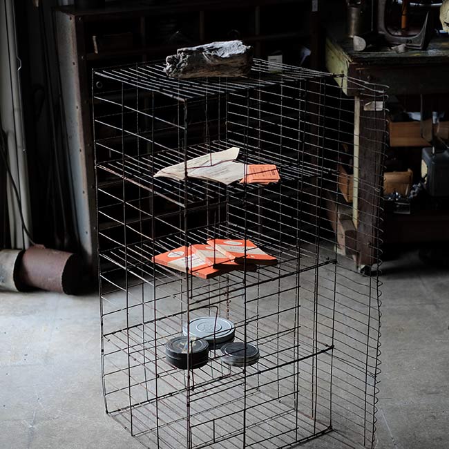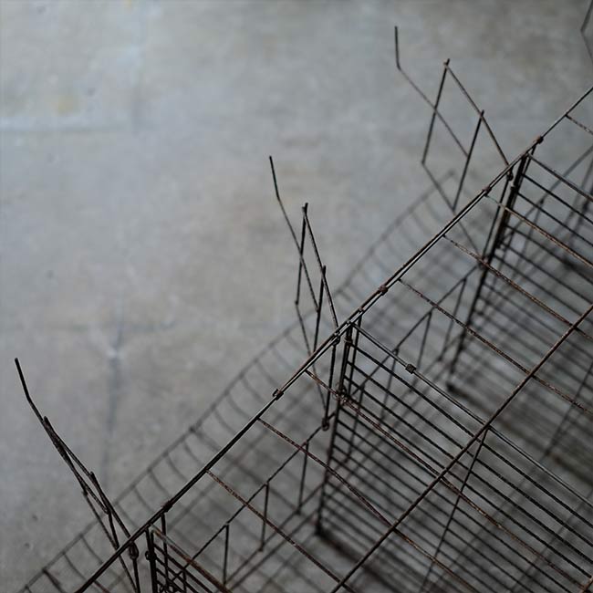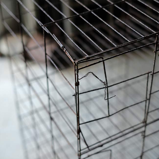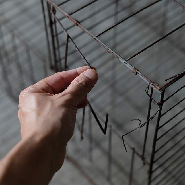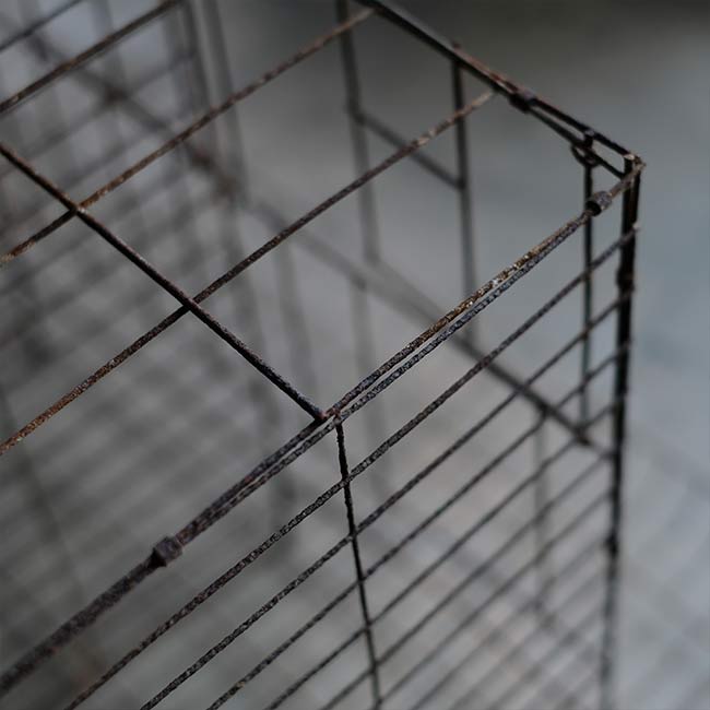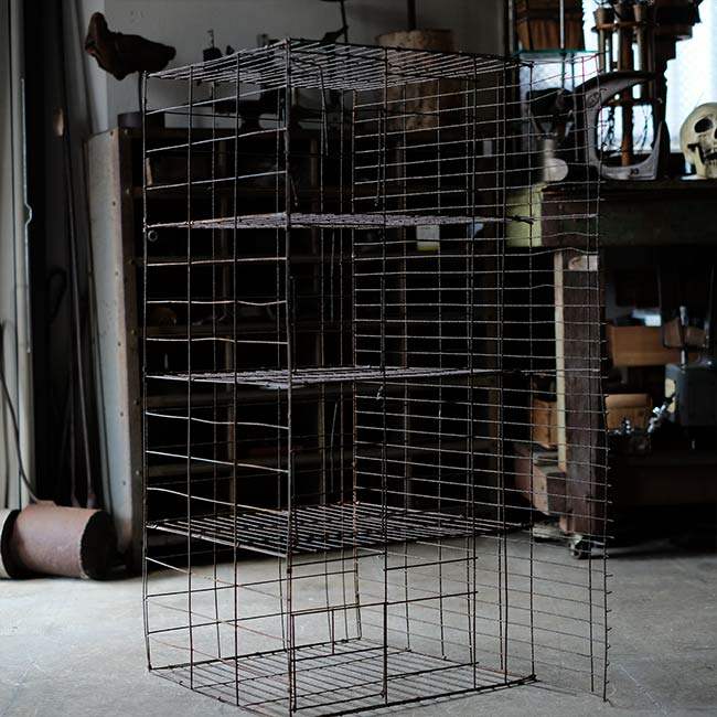 細めのワイヤーで作られた古いニワトリのケージ。手前の下に伸びている部分は、産み落とされた卵の受け皿で、内部は仕切りがついて4部屋という仕様になっています。
