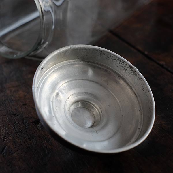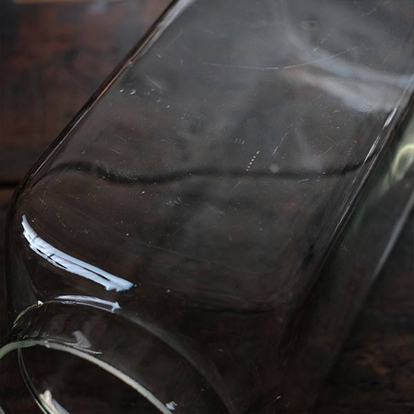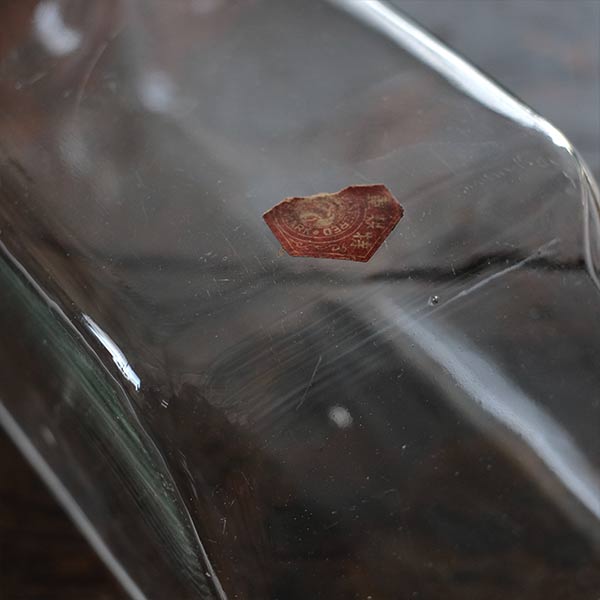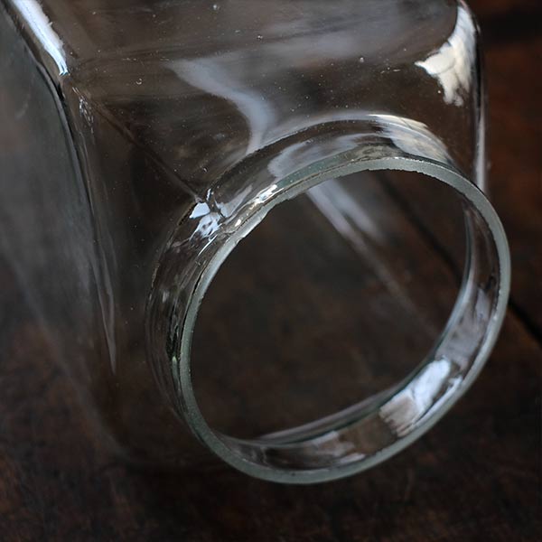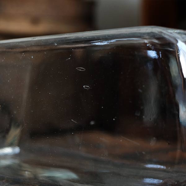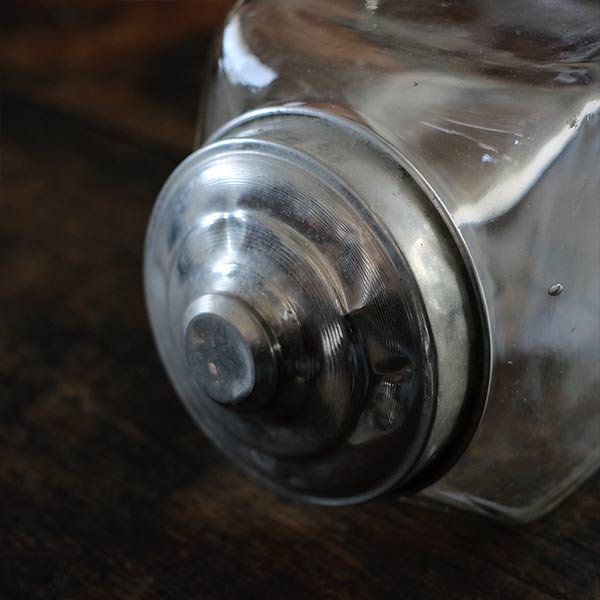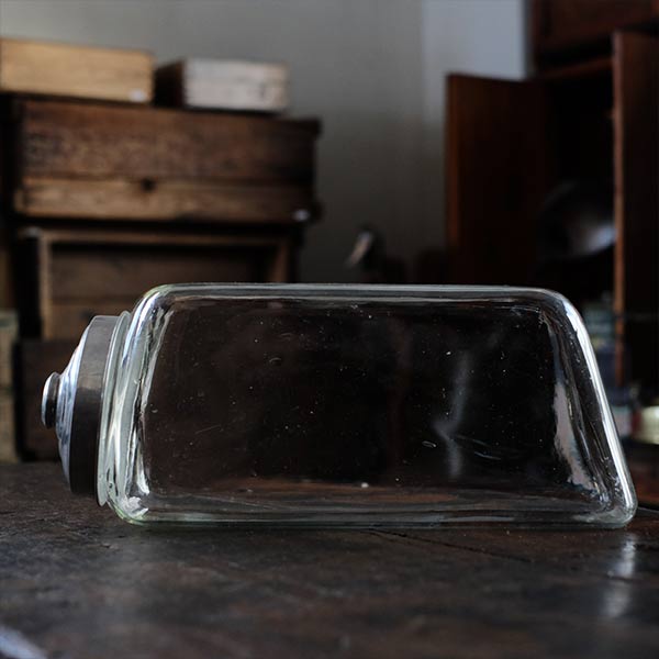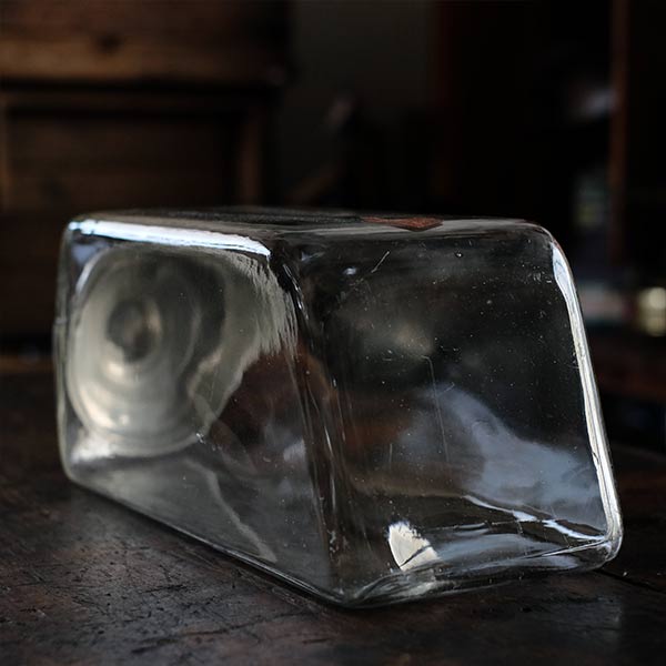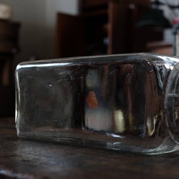 ガラスの容器といえば上に口があるのがごく一般的ですが、この瓶は側面に口がついています。なお蓋の反対側は垂直ではなく、傾斜しているところも特徴です。