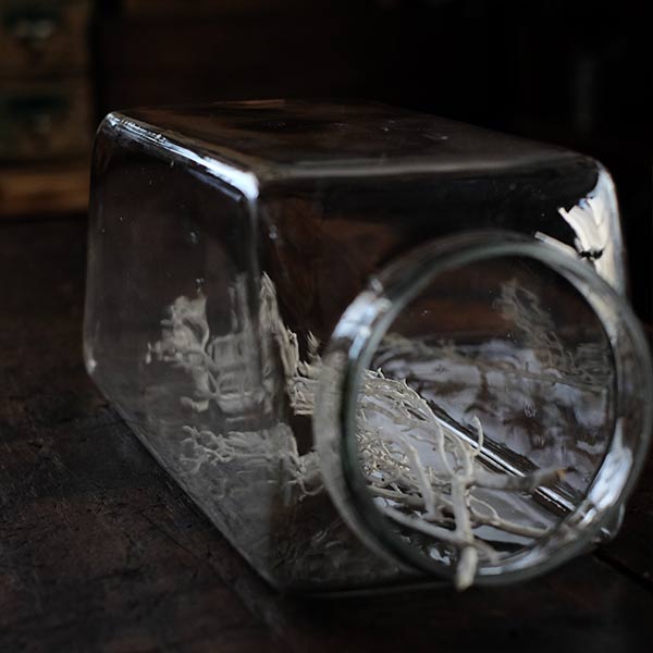 完全には密閉できないため、食品の保存には向きませんが、袋入りのお菓子やペットフード、小物の整理収納に。あるいはドライフラワーをディスプレイしたり、イルミネーションライトを入れたり、小さなもののディスプレイにもお使いいただけるかと思います。気持ちよくお使いいただけるよう、蓋もガラス面も入念にクリーニング済みです。