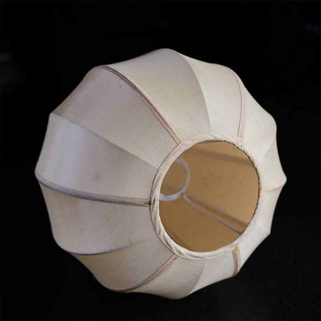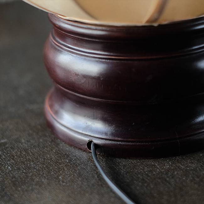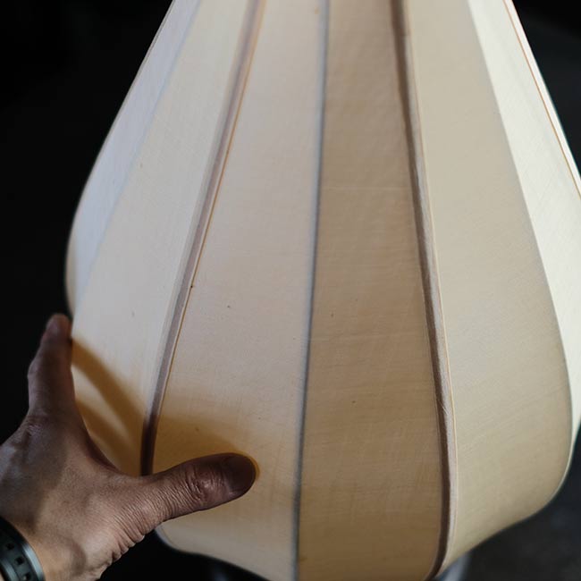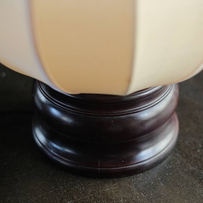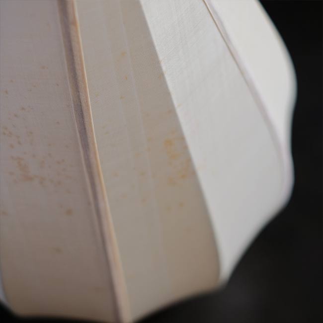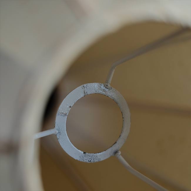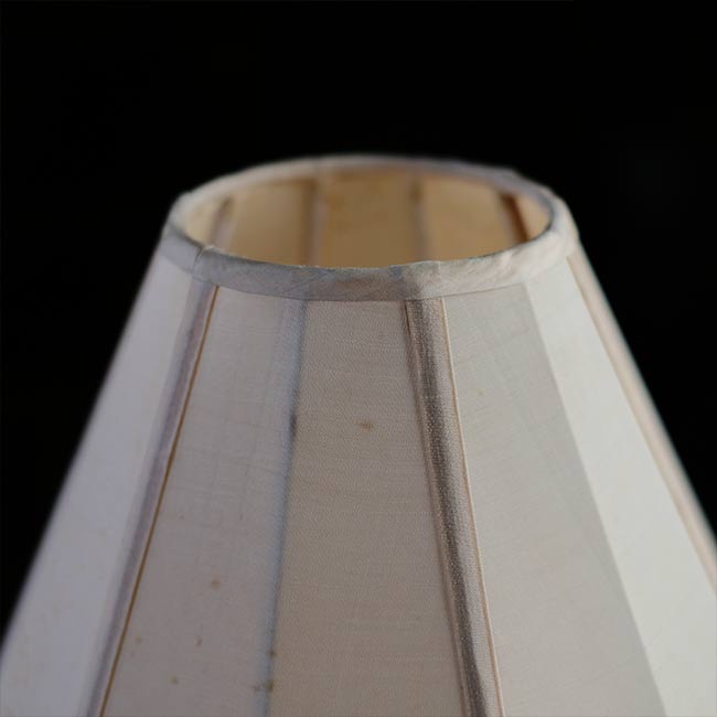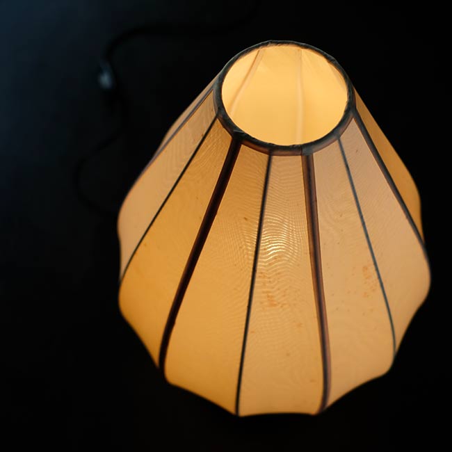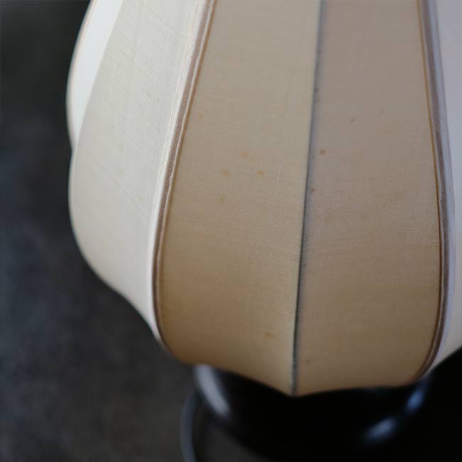 シェードはワイヤーにベージュの布を張ってありますが、シミが見受けられます。台座は木製で、小キズが見られますことをご了承下さい。
