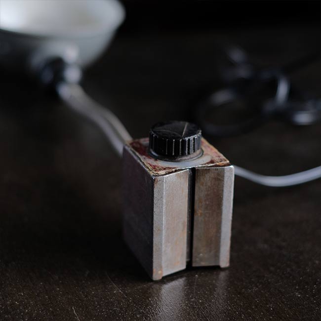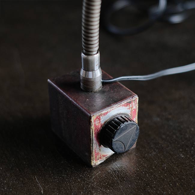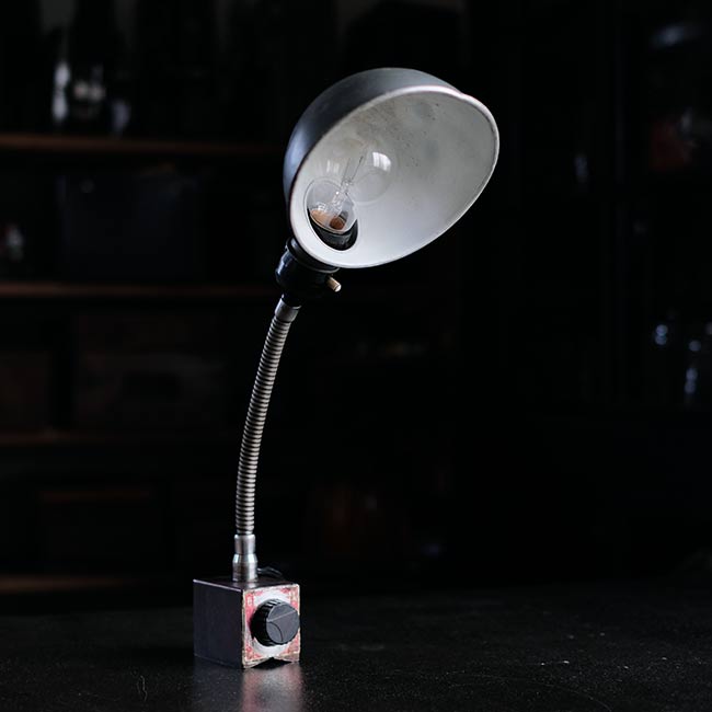 工場で使われていたマグネットライト。名前のとおり台座がマグネットになっていて、鉄のものなら何にでもくっつけておくことができます。なお台座にはスイッチが付いているので、くっつけたくない場合はOFFにします(左がON、右がOFF)。