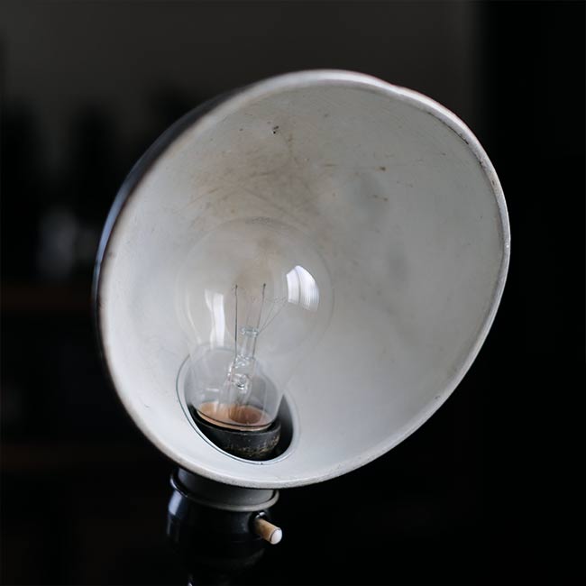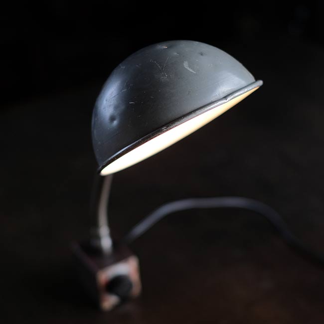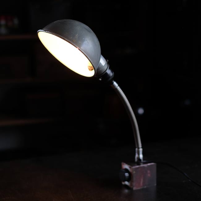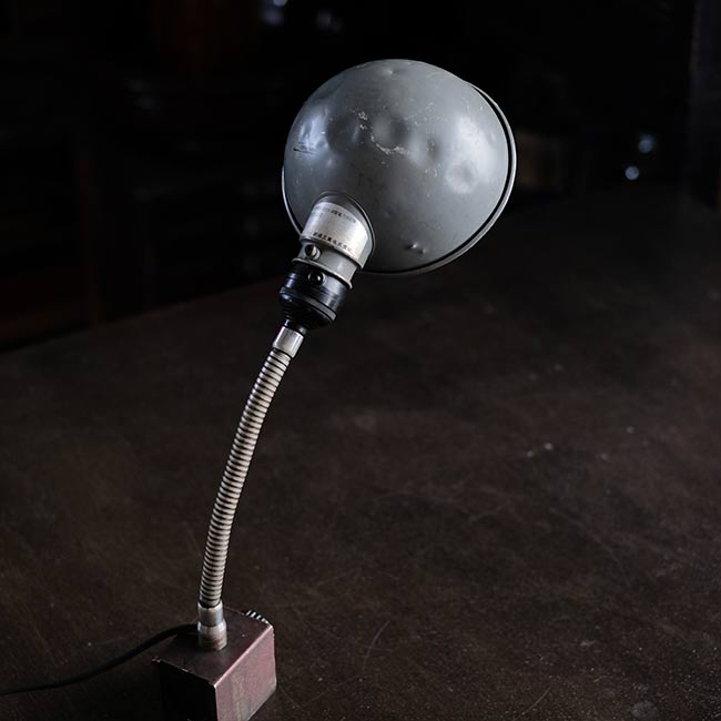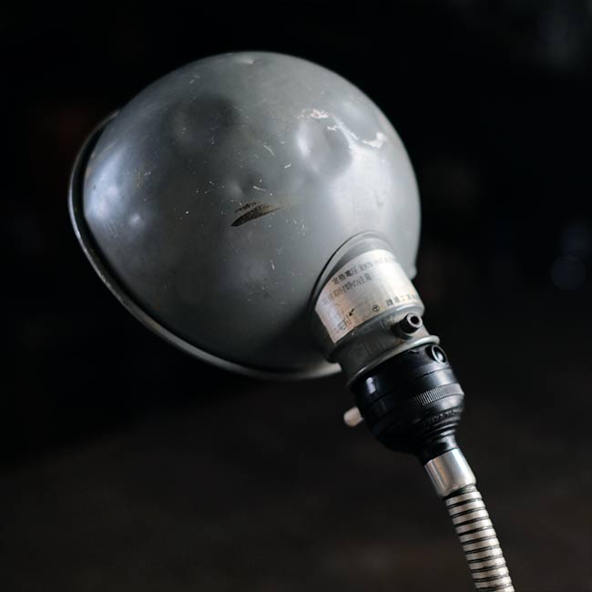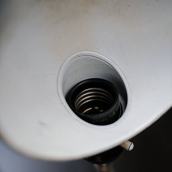 工場でヘビーに使われていたようで、シェードからベースまで油まみれだったため、入念にクリーニングし、サビは磨き落としました。が、落としきれない汚れや凹みなどが残りますことをご了承下さい。