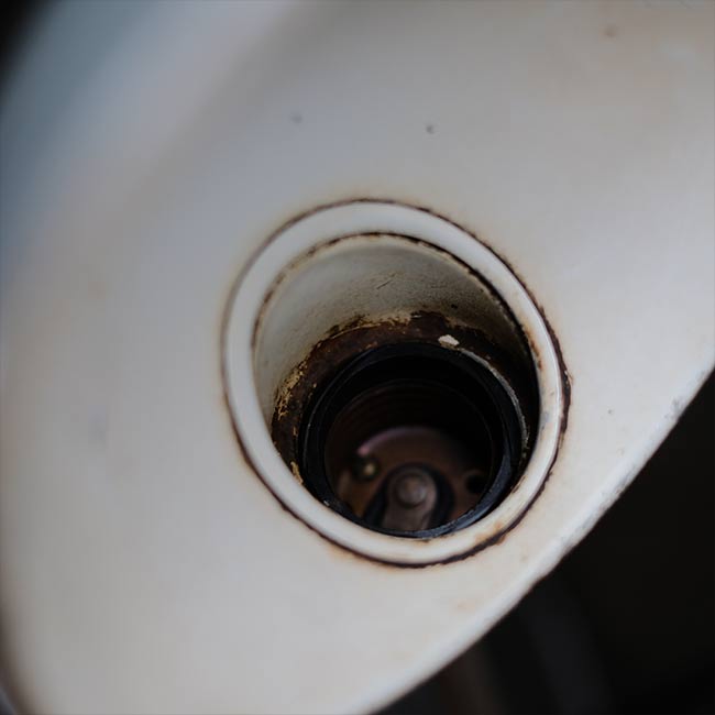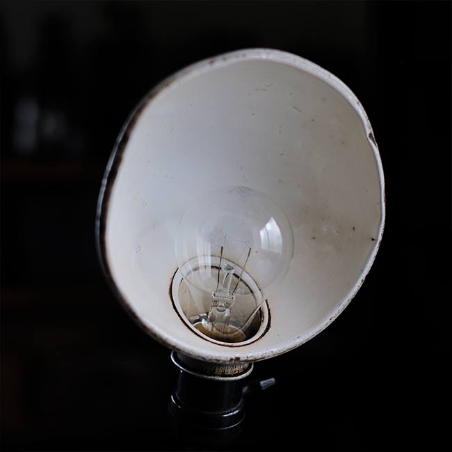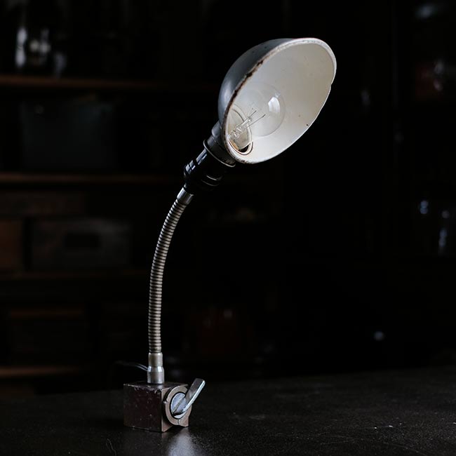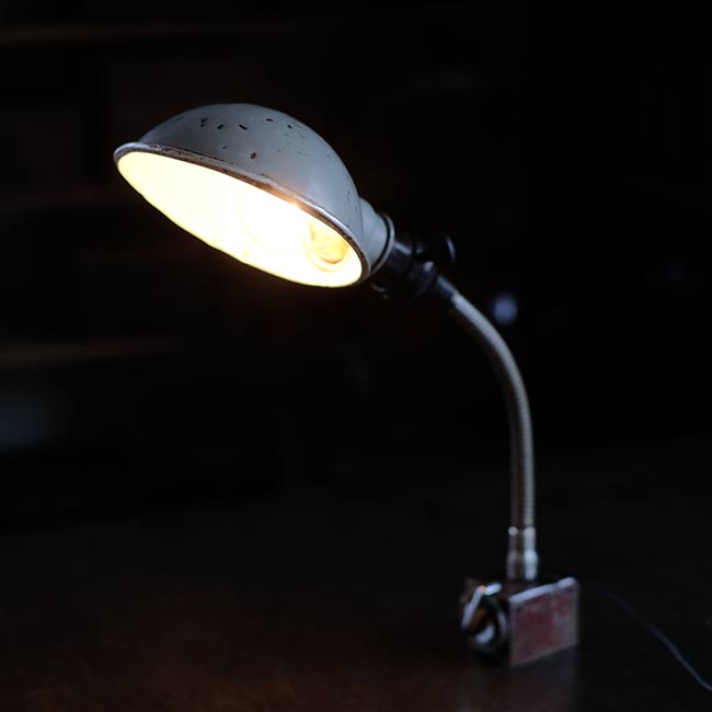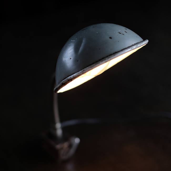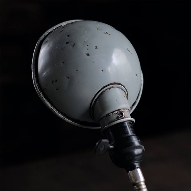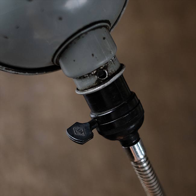 工場でヘビーに使われていたようで、シェードからベースまで油まみれだったため、入念にクリーニングし、サビは磨き落としました。が、落としきれない汚れや凹みなどが残るのと、ソケットの付け根にぐらつきがあったため、テープで補強しております。なおシェードをソケットに留めるネジが欠損していたため、ゴムを挟んで抜けにくくしておりますことをご了承下さい。