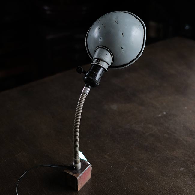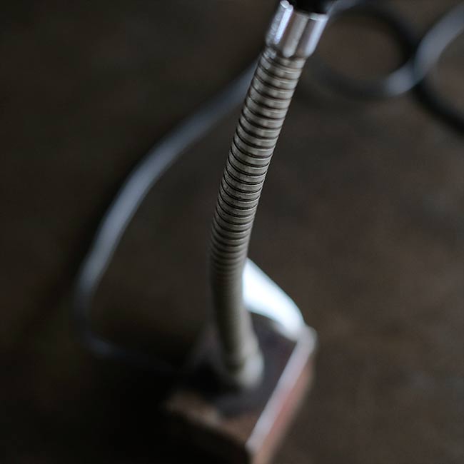 コードとプラグは新品に交換。使用する電球はE26(別売り)。グースネックなので、角度調節は自由自在です。なお接触の関係でスイッチがつきづらい場合がありますが、どうか根気よくお付き合い下さい。