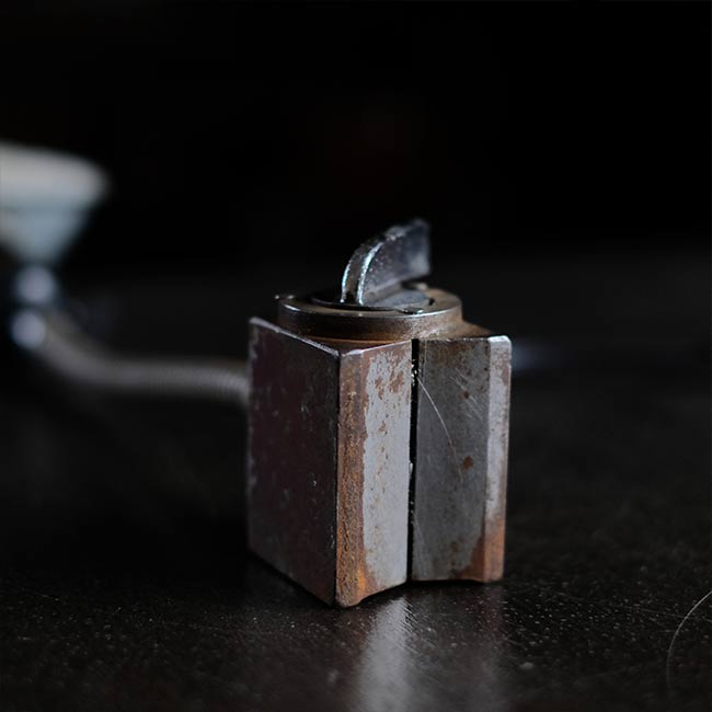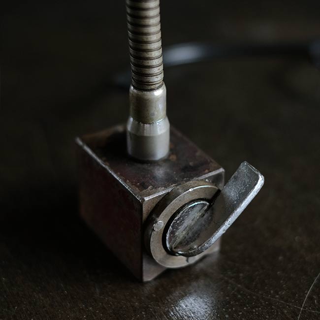 工場で使われていたマグネットライト。名前のとおり台座がマグネットになっていて、鉄のものなら何にでもくっつけておくことができます。なお台座にはスイッチが付いているので、くっつけたくない場合はOFFにします(左がON、右がOFF)。