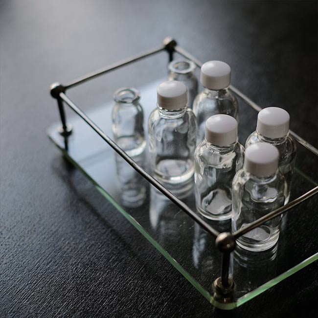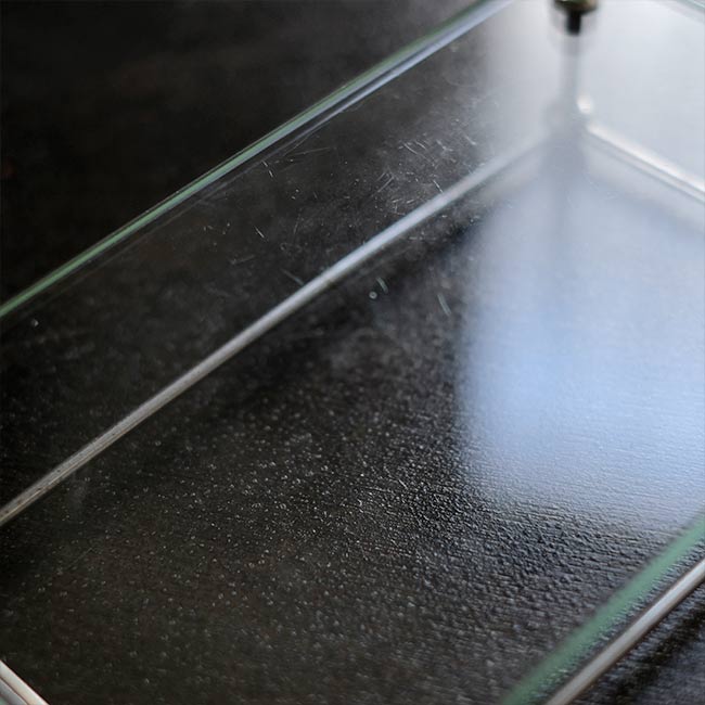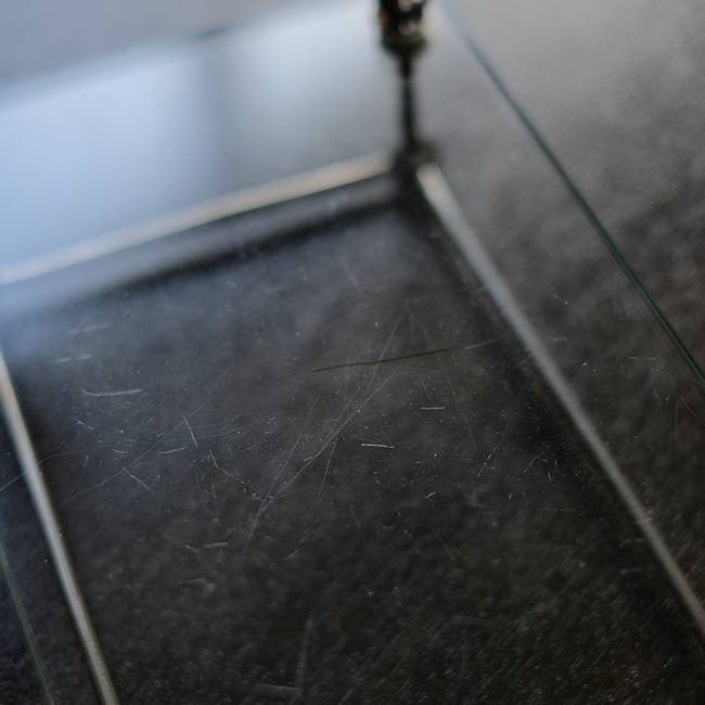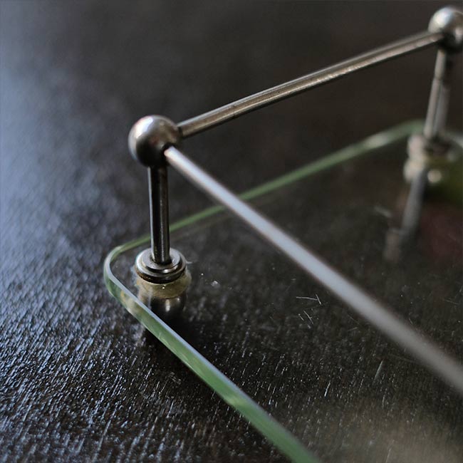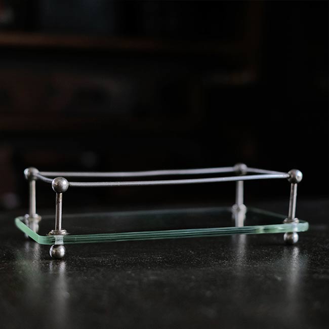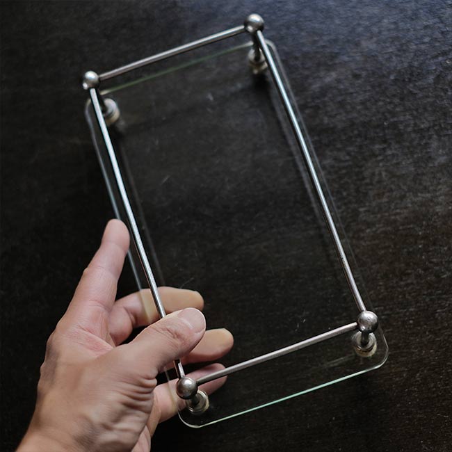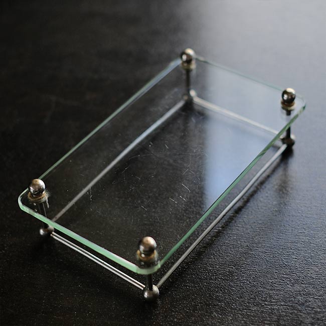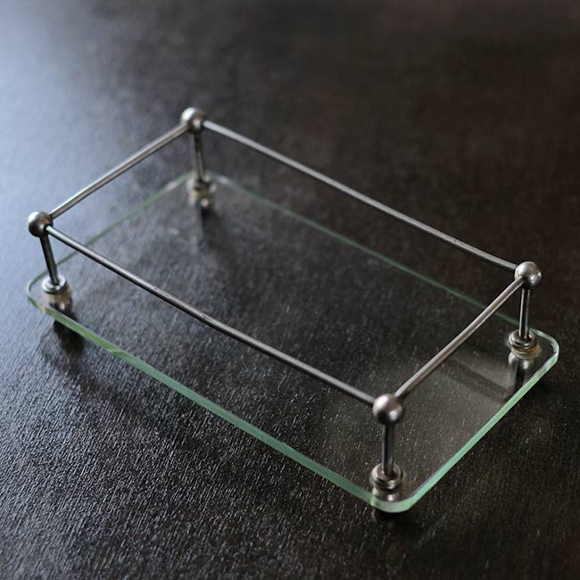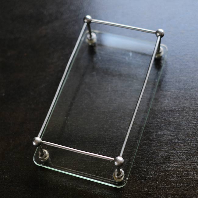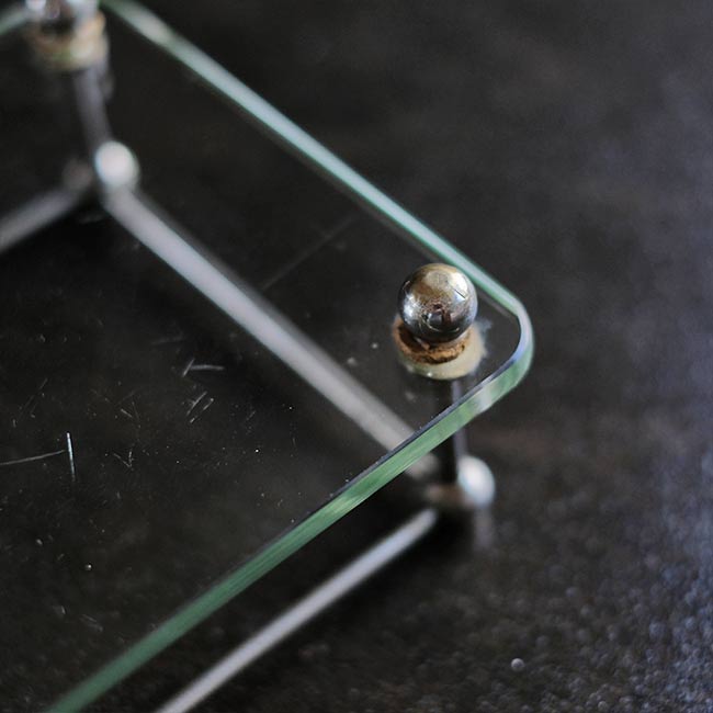 ガラス板にポールを固定して四方を囲ったラック。おそらく病院でガラス瓶などをまとめておくのに使ってたのではないかと推測します。ポールが上にくる方の向きで使われていたようですが、どちらの面でも使えます。
