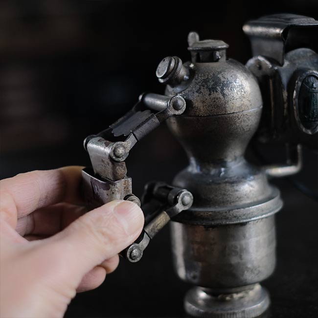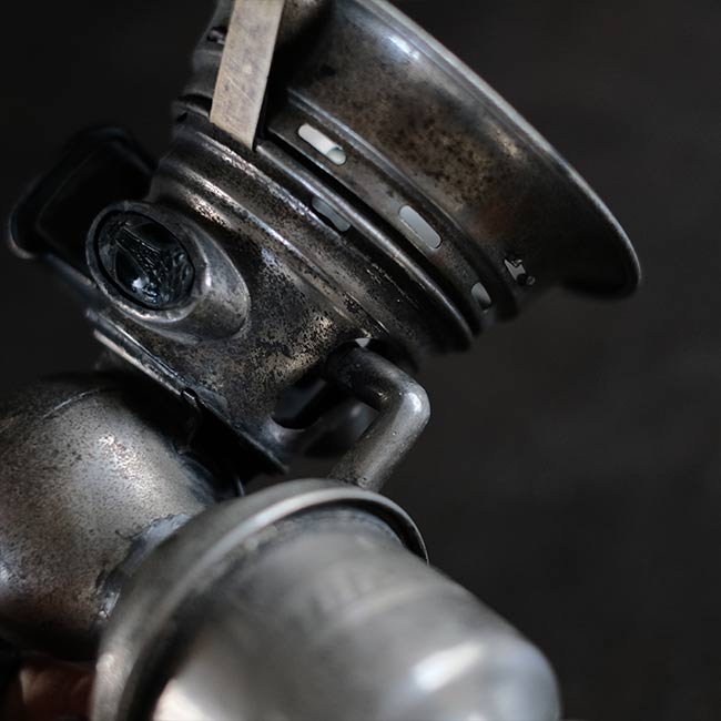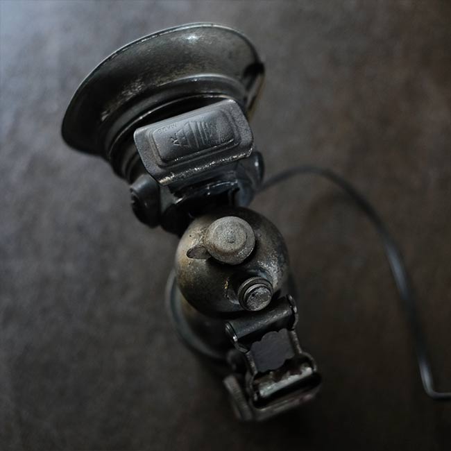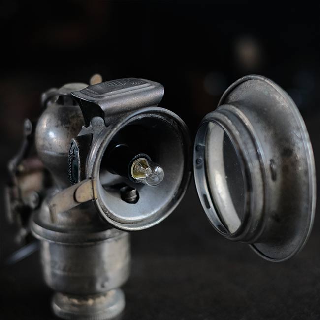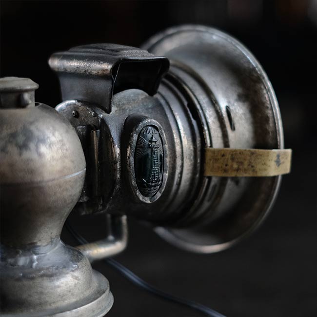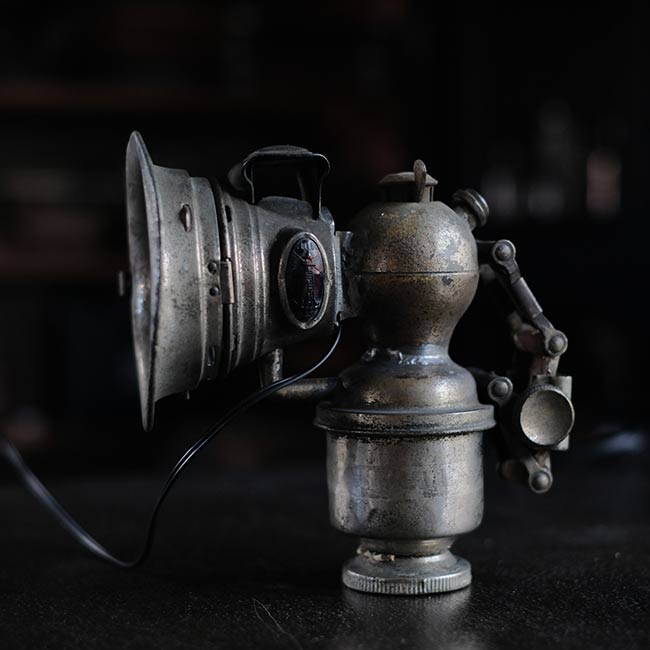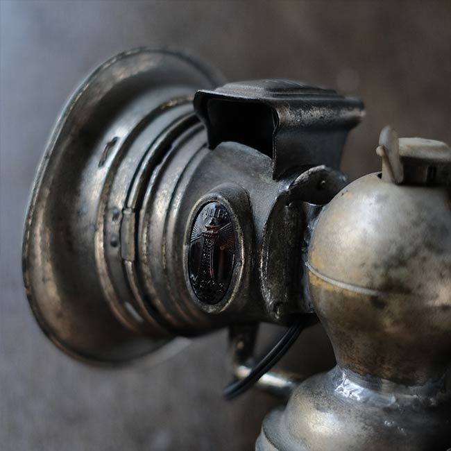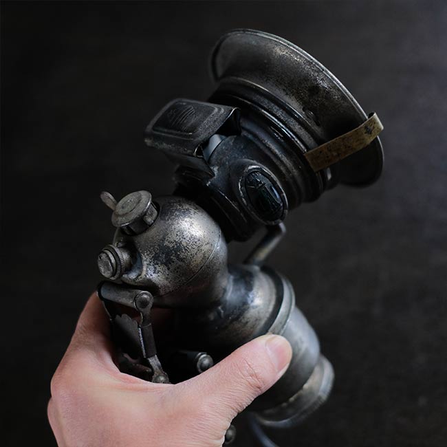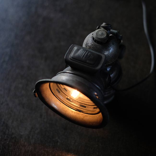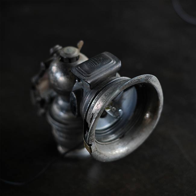 1869年創業のイギリスのメーカー ミラー社のカーバイドランプ(アセチレンランプ)を使ったランプになります。シェードの中央部分にソケットを仕込んであります。元は自転車用のハンドルに取り付けて使うランプでしたが、ハロゲンライトが使われはじめる1930~1940年代までは、オートバイにもこういったランプ使われていたそうです。