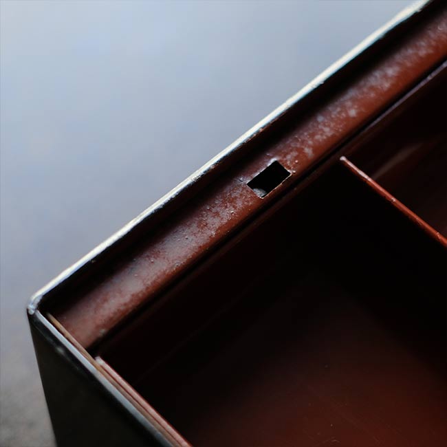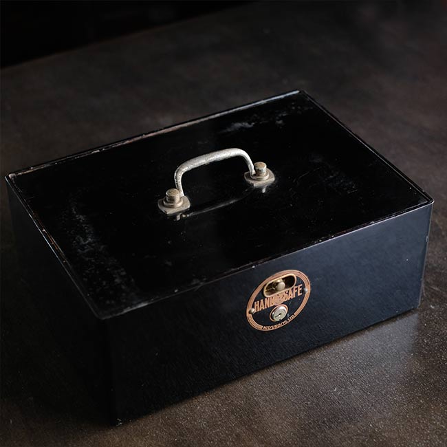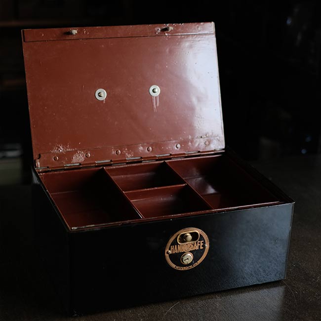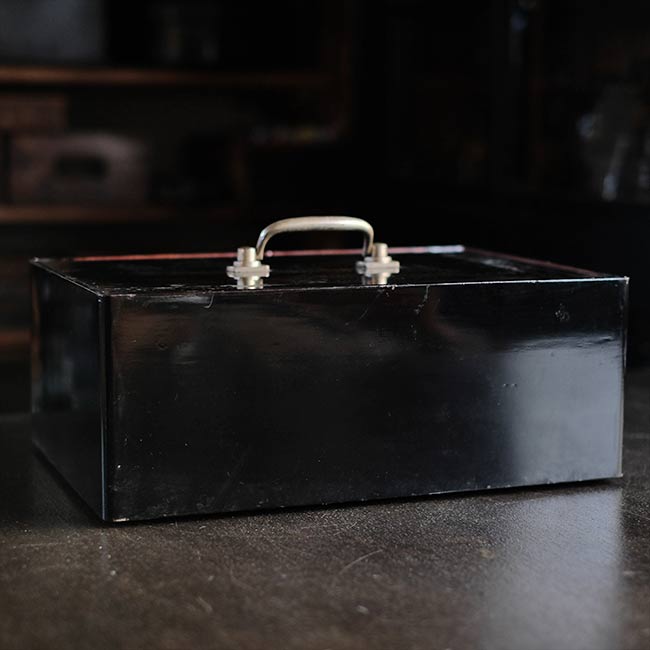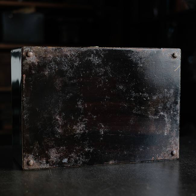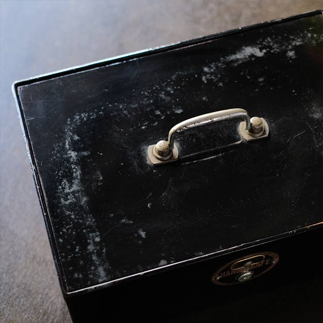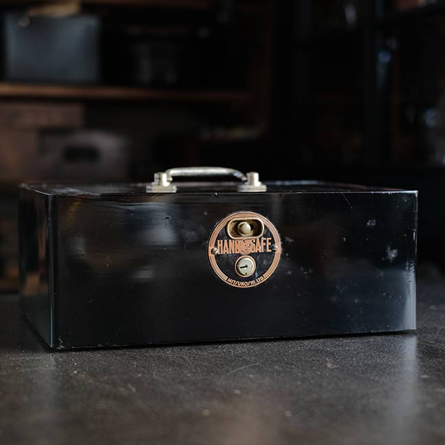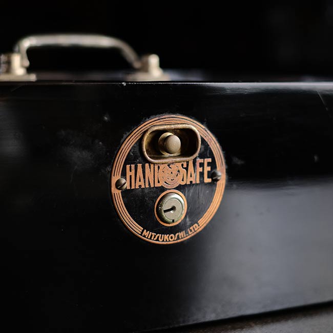 三越のポータブル金庫になります。年代こそわからないものの、マイナスネジが使われているので、そこそこ古いものでしょう。蓋が真っ平らな板状というのも珍しいです。