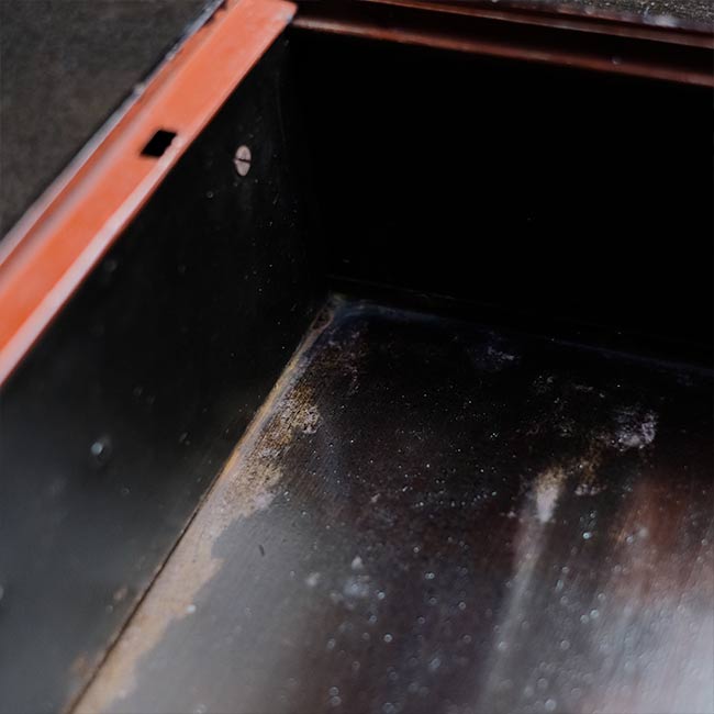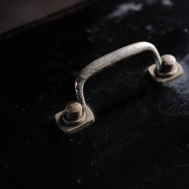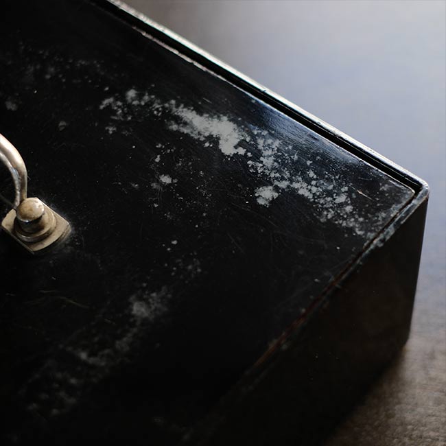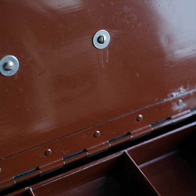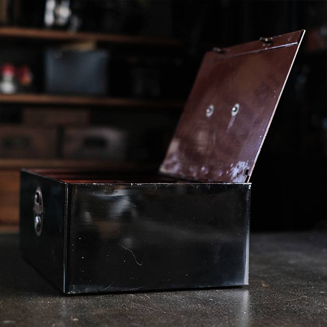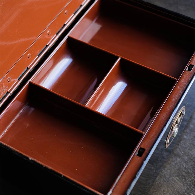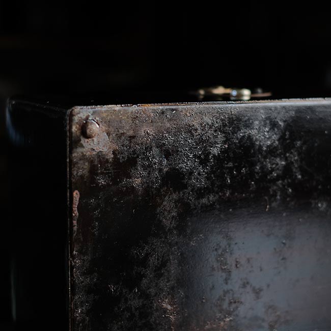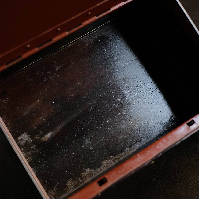 金属部分のくすみやサビといったダメージは見られますが、ひどいレベルのものではなく、十分実用できるレベル。蓋を開ける際は前面のレバーをスライドさせますが、鍵は付属しないため、かけることはできません。
