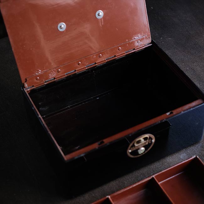 内部は金属製のトレー付きで、底はA4サイズが若干のゆとりをもって収まるサイズ感となります。金庫だけなく、文具や工具他、身の回りのこまごましたものの整理、収納にも。