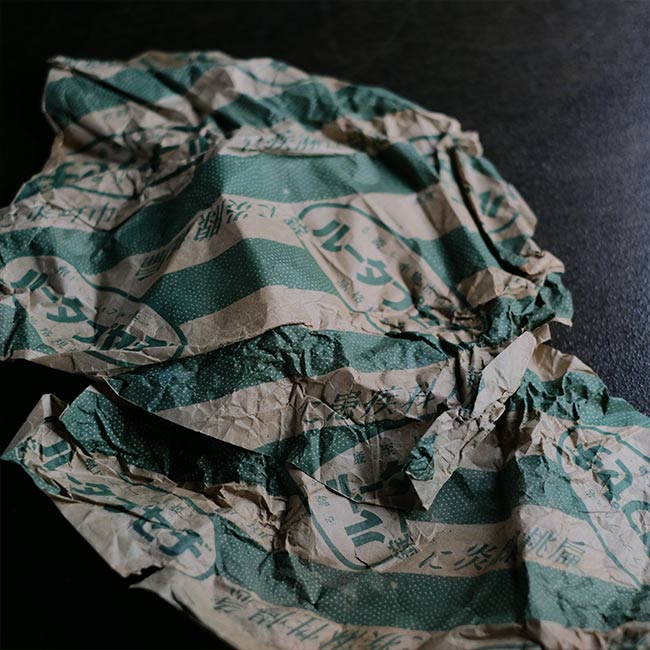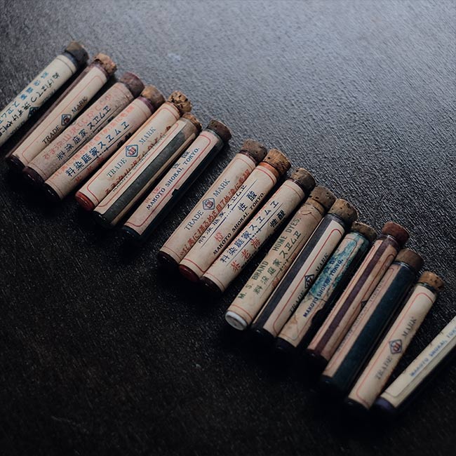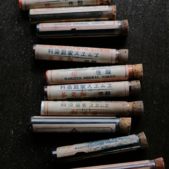 粉末染料の瓶が古紙にくるまった状態で入荷しました。古紙は1930~1940年代に使われていたヂセプタールという薬の紙なので、染料瓶も同じ時代のものでしょう。ちなみに文字は右書きです。