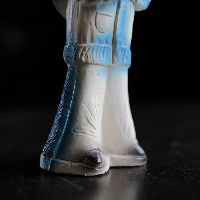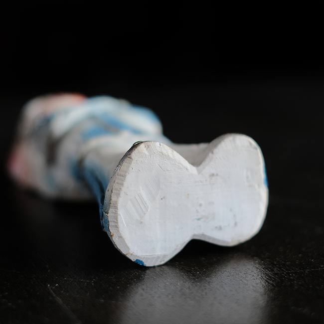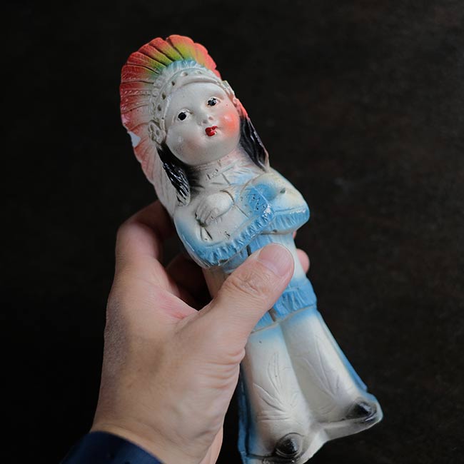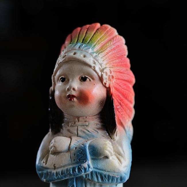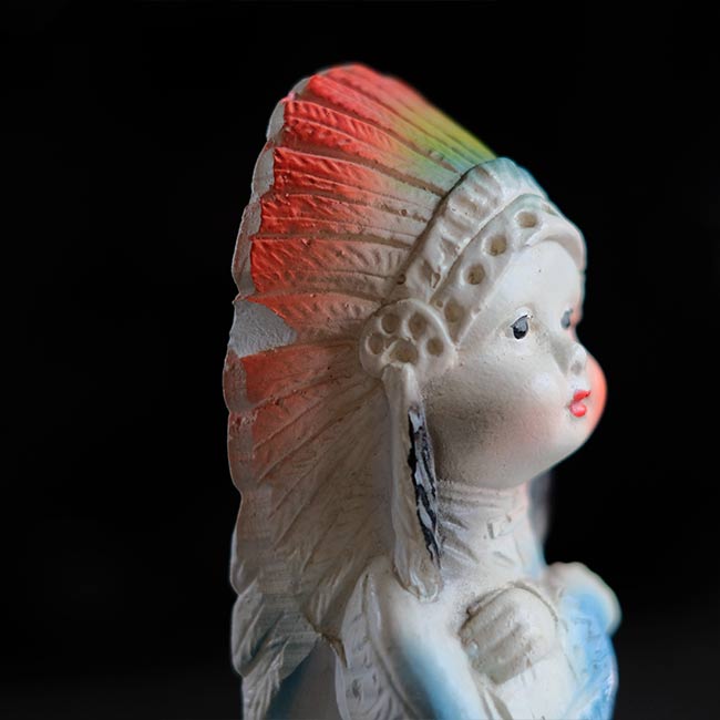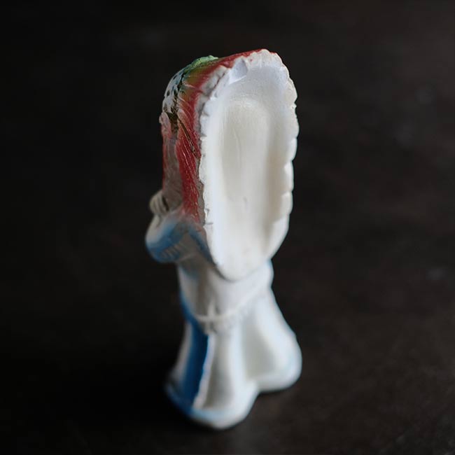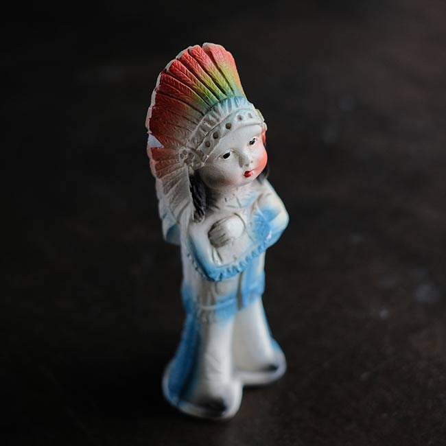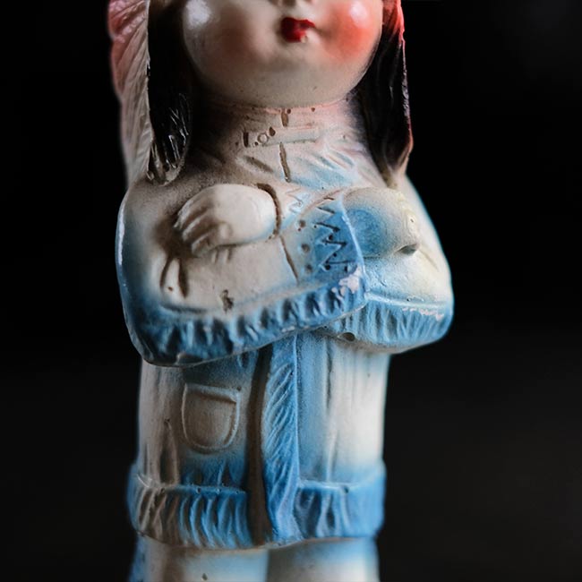 1930~1940年代頃のネイティブアメリカンの子供のフィギュアになります。当時カーニバルの景品だったもので、カラフルなペイントが特徴。素材はおそらく石膏で、鋳込みで作っているものと思われます。