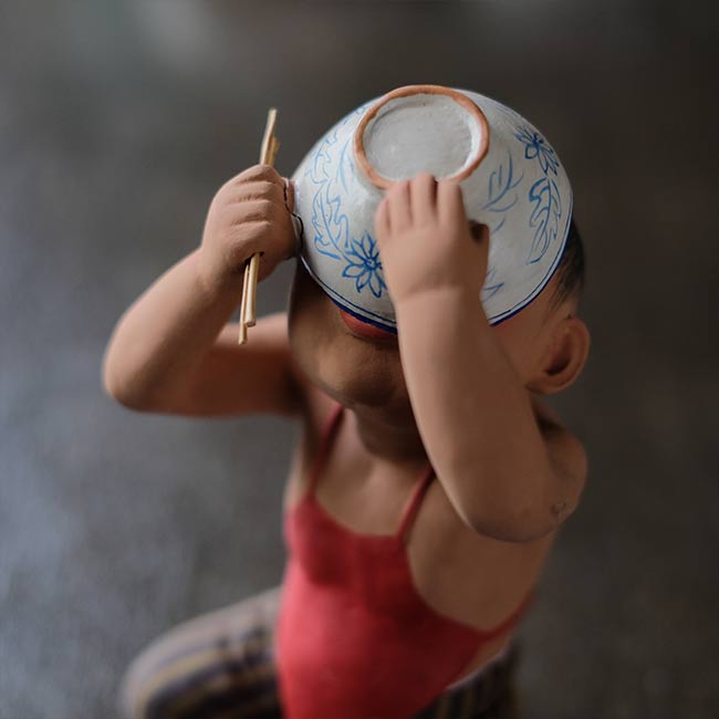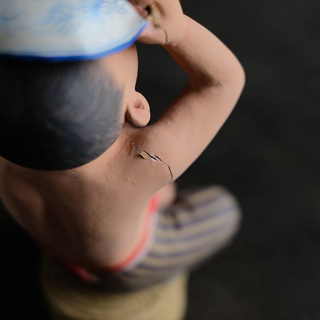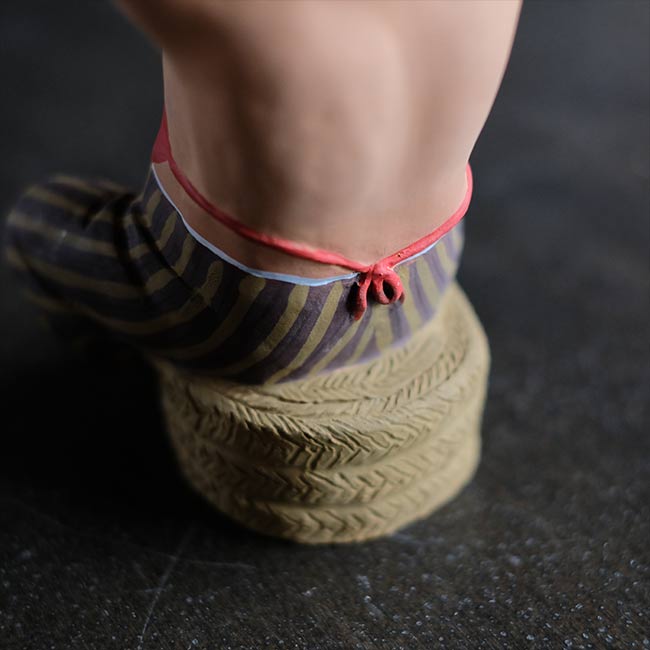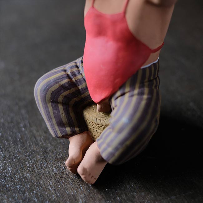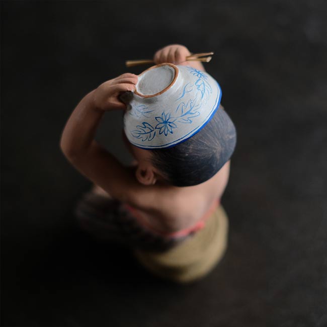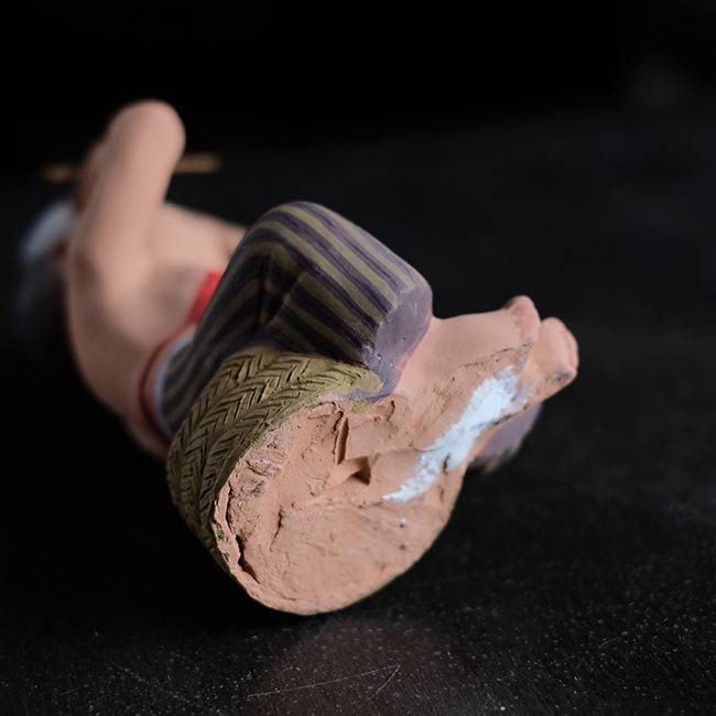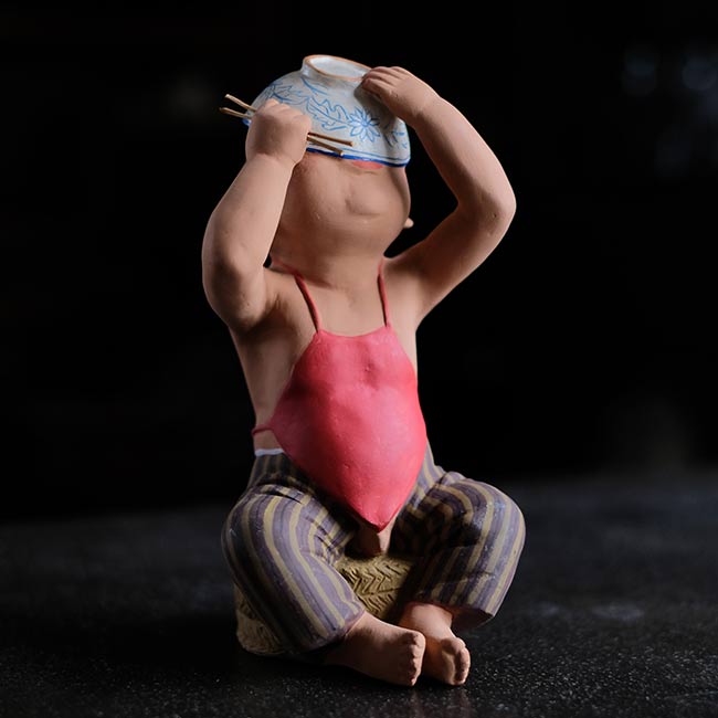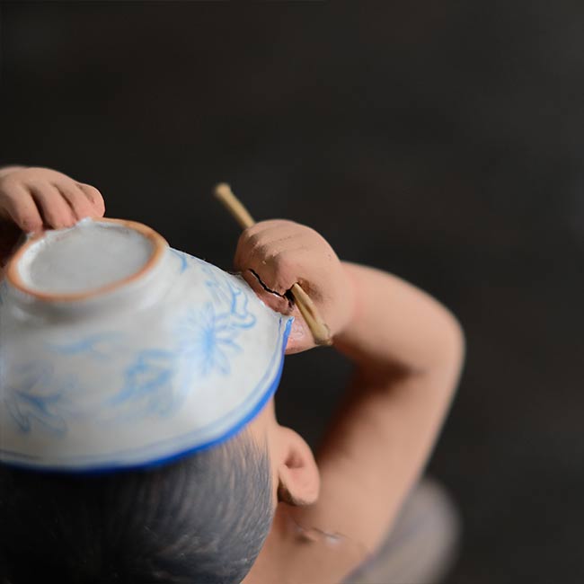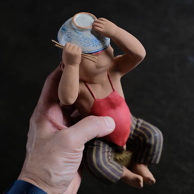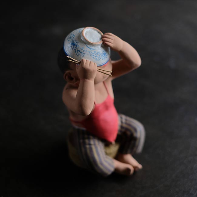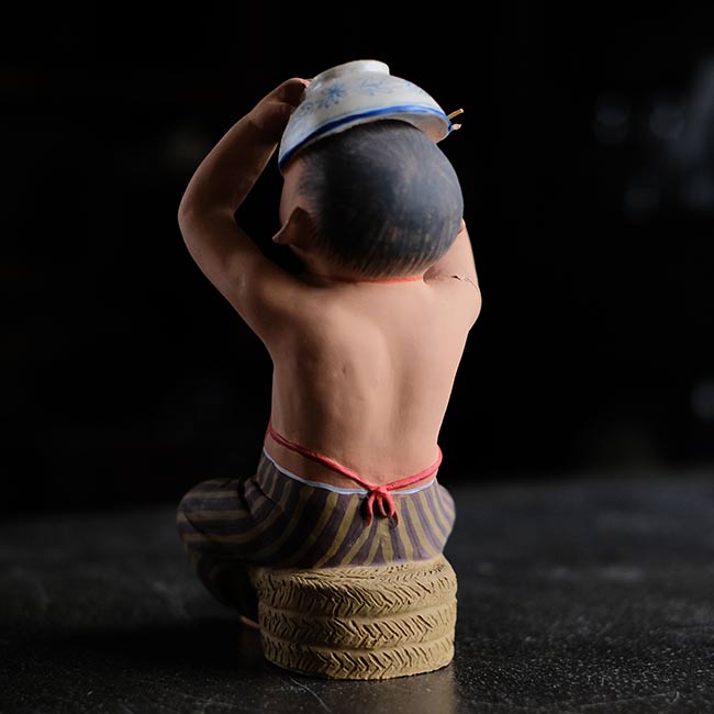 どんぶりに残った汁をすすっている小僧さん。素材は陶器。右手には箸をにぎっていて、つくりが細かいです。ちなみにズボンをはいていますが、なぜかあそこが飛び出している。