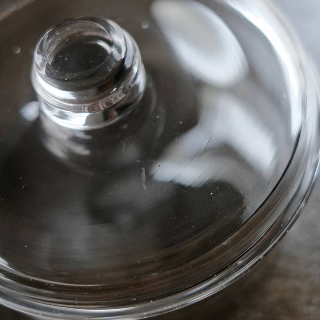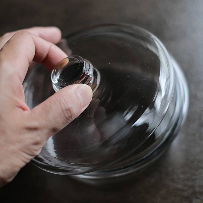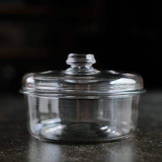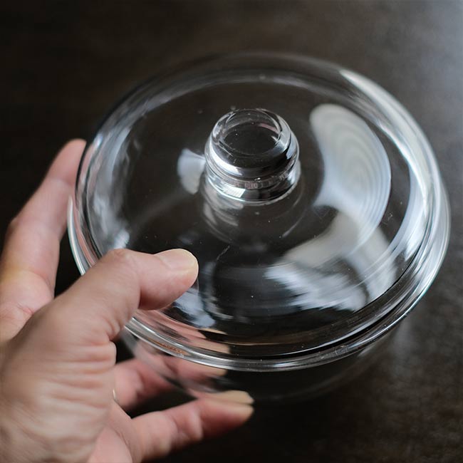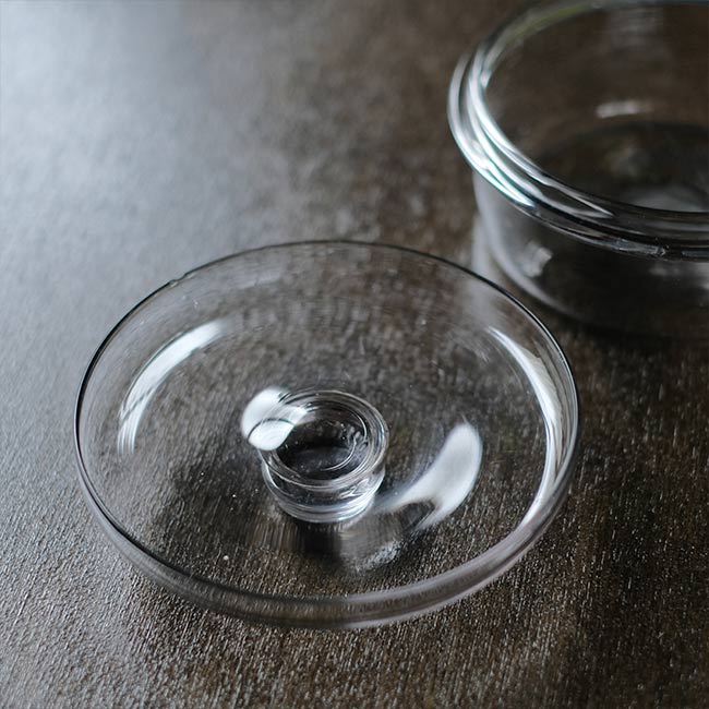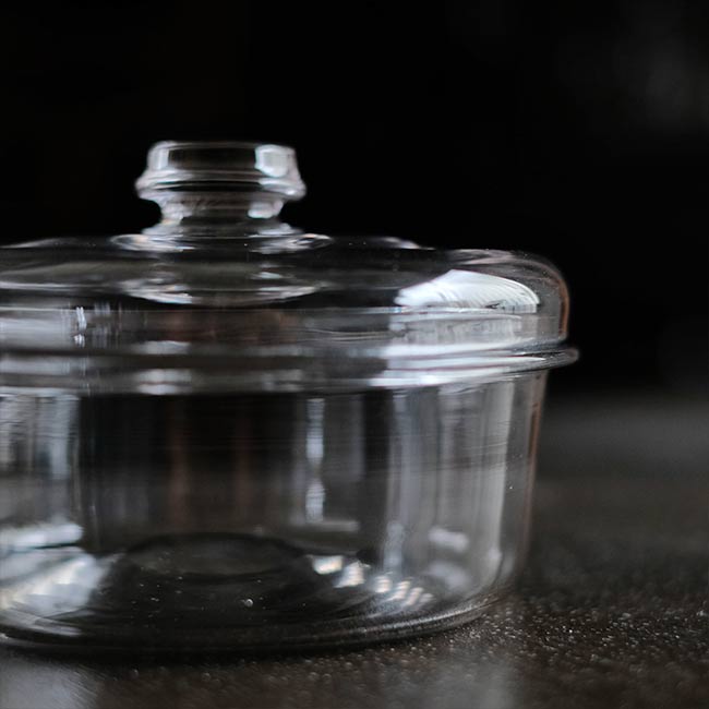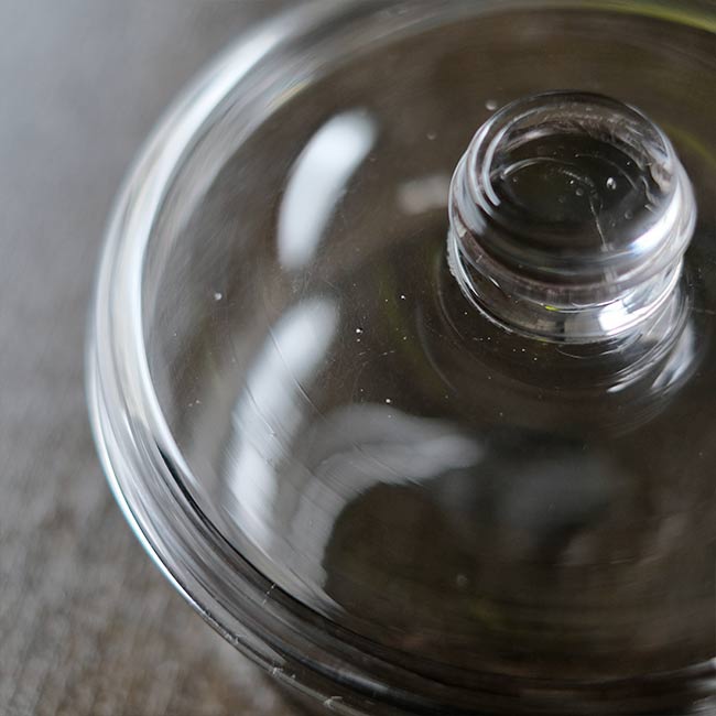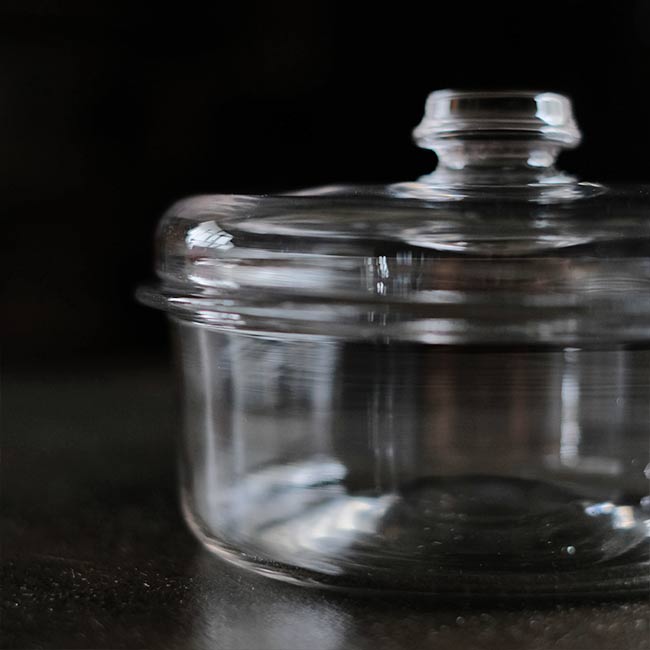 菓子瓶やクッキージャーは扱ってきましたが、こういった日本の古手のキャニスターは初めてかもしれません。品のあるガラスの容器になります。ガラス内にはシワや気泡が見られ、形も微妙にゆがんでいますが、量産品にはない魅力です。