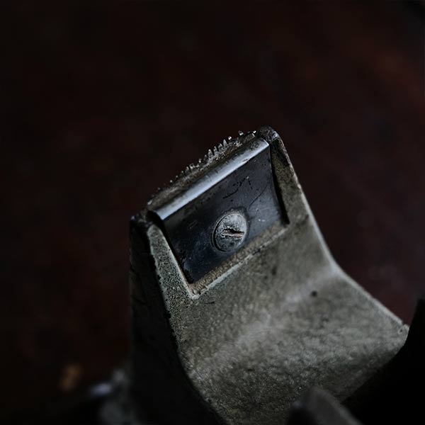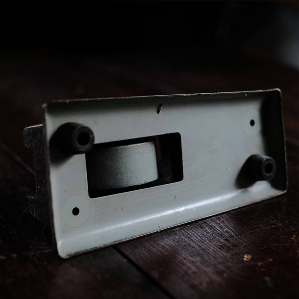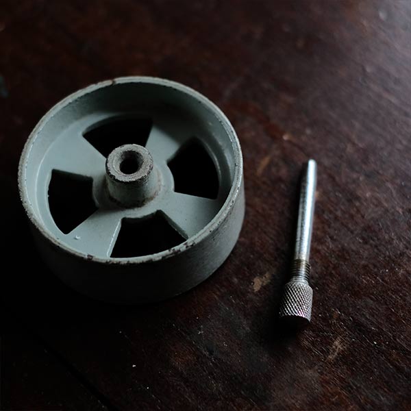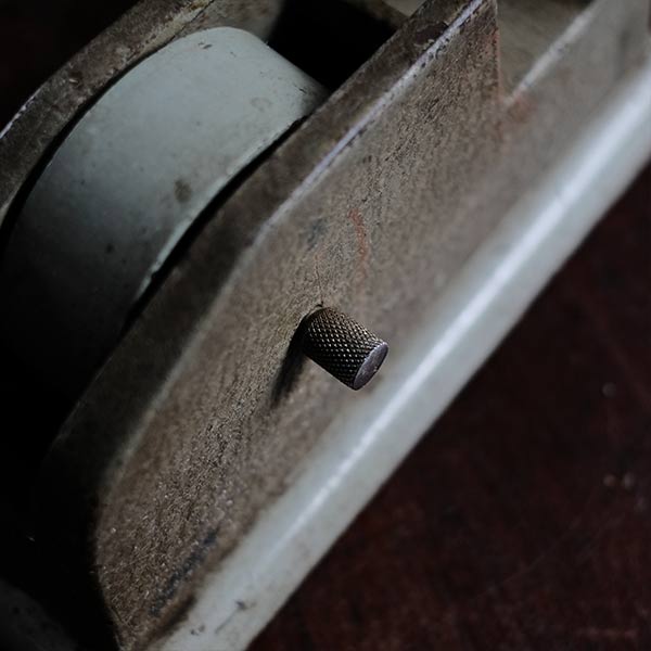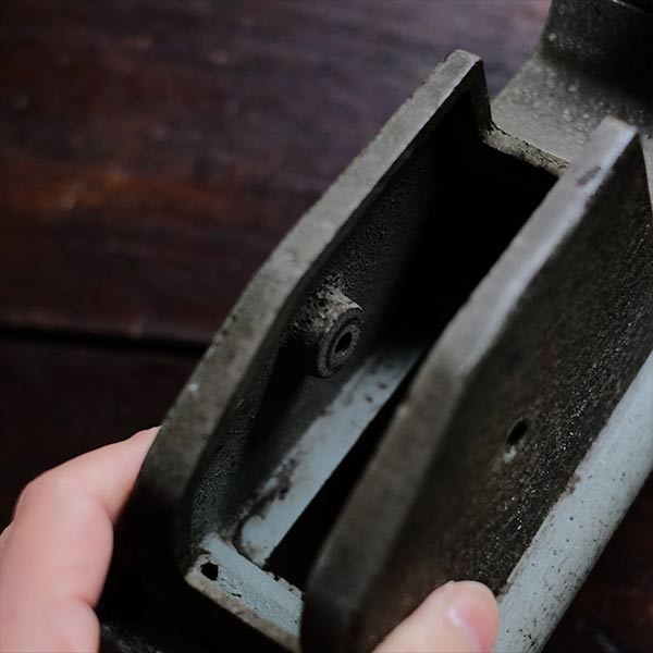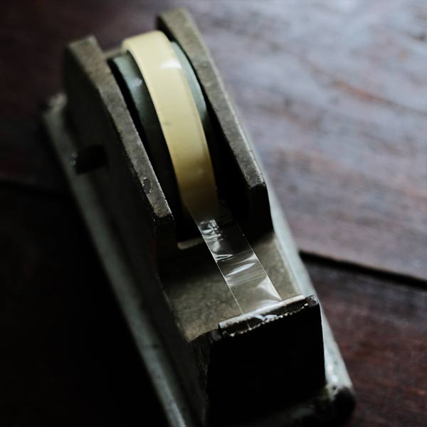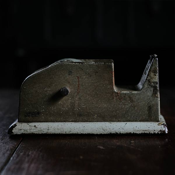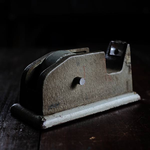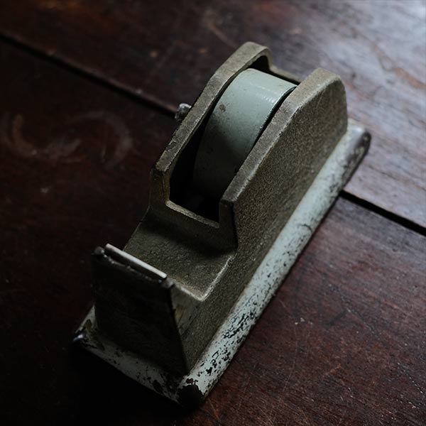 オープン工業製と思われる鉄製の古いテープカッターです。重さ1.7キロと、安定感は抜群。錆びや黒ずみ、塗装の剥がれが見られ、また底のゴムの脚が2つ欠損していますが、使用に支障はありません。