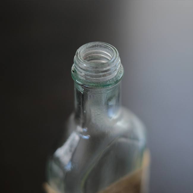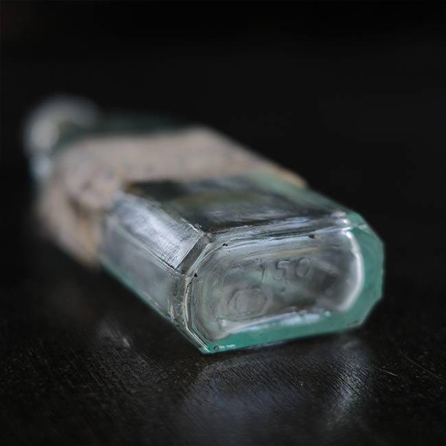 ガラスは涼しげな淡いブルーで、内部に若干落としきれない曇りが残ります。またラベルもダメージがありますが、ほどよく古びた感じ。そのまま飾っても絵になりますし、一輪挿しにしても。