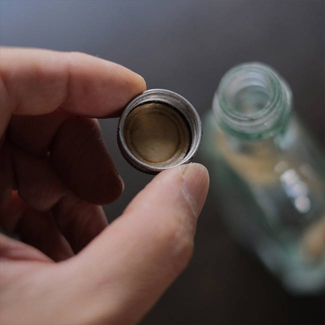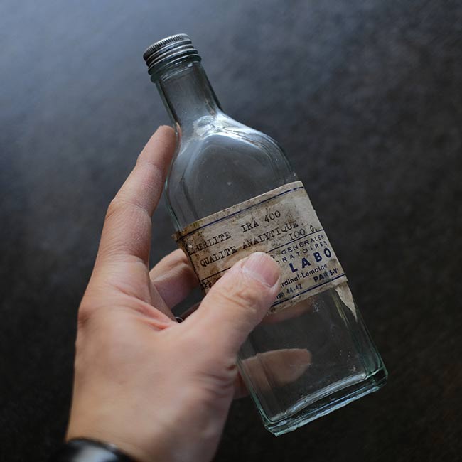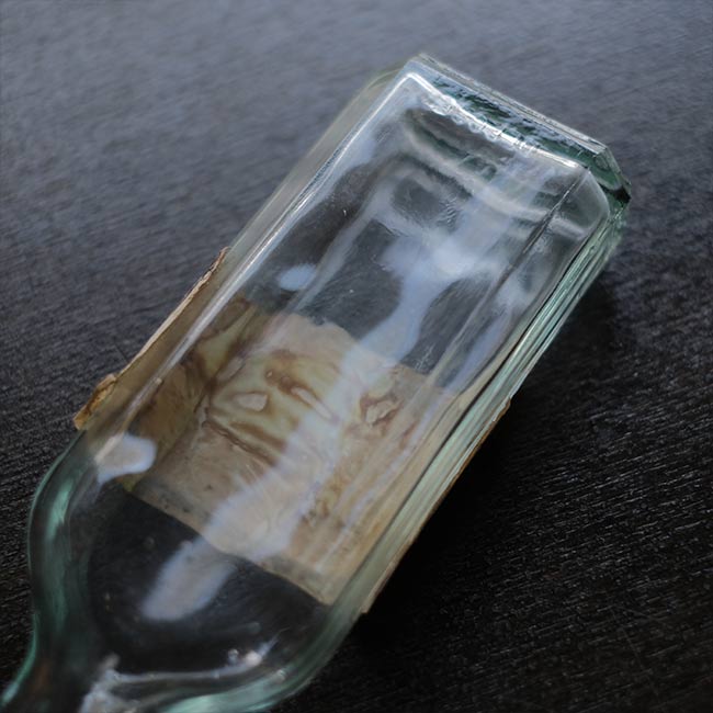 キャップとラベルの残った古いボトル。薬瓶の類かと思いますが、詳細はつかめず。