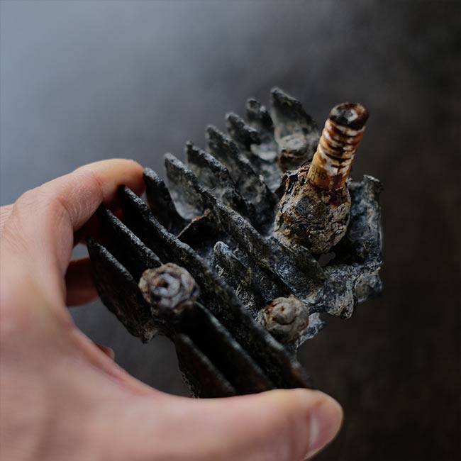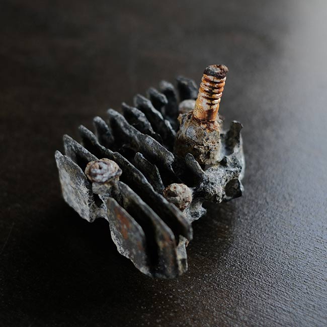 長い年月 海を漂っていたエンジンの一部。なかば石化しているようにも見えますが、端に突き立ったプラグが残ってなかったら、間違いなく手は伸びなかったでしょう。最高のオブジェだと思います。