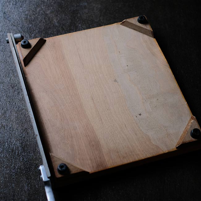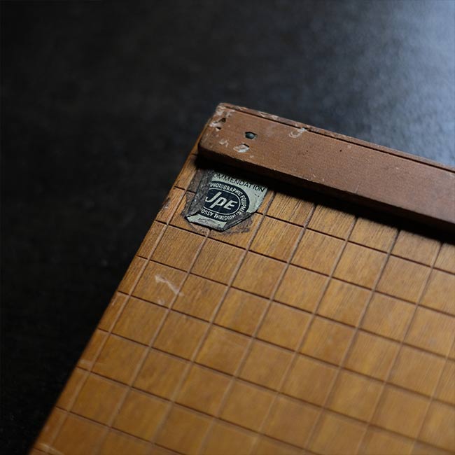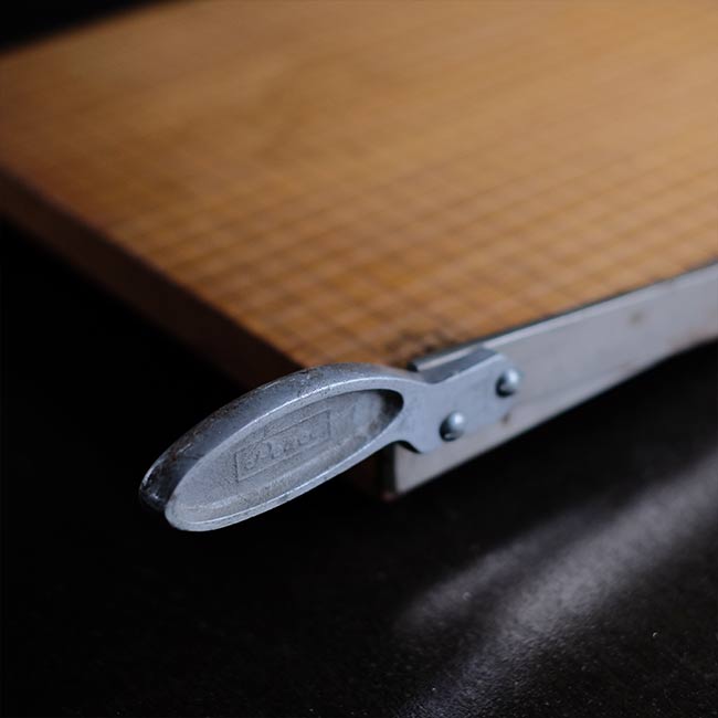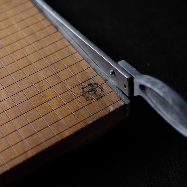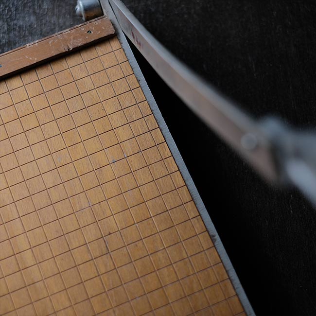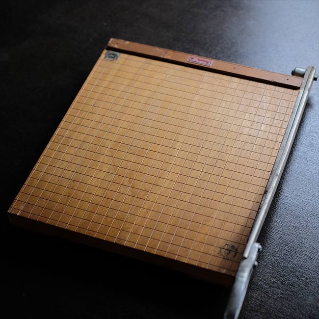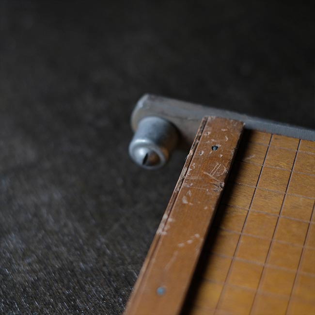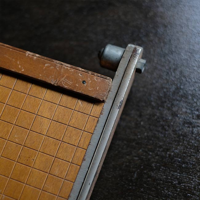 メーカーについてはわかりませんでしたが、マイナスネジが使われた古めの裁断機になります。ラベルに「JPE JAPAN PHOTOGRAPHIC EQUIPMENT INDUSTRIAL ASSOCIATION」とあるので、写真用だったのかもしれません。