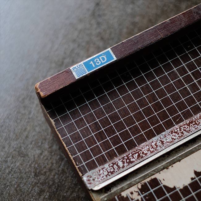 プラス社の古い裁断機になります。波模様の入ったロゴは永井一正がデザインしたもので、1972~1988年まで使われていたそうです。