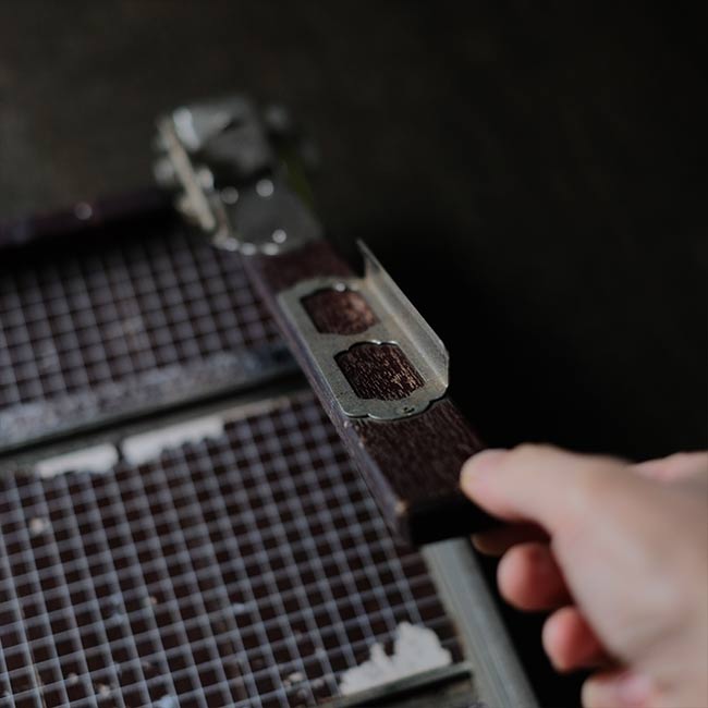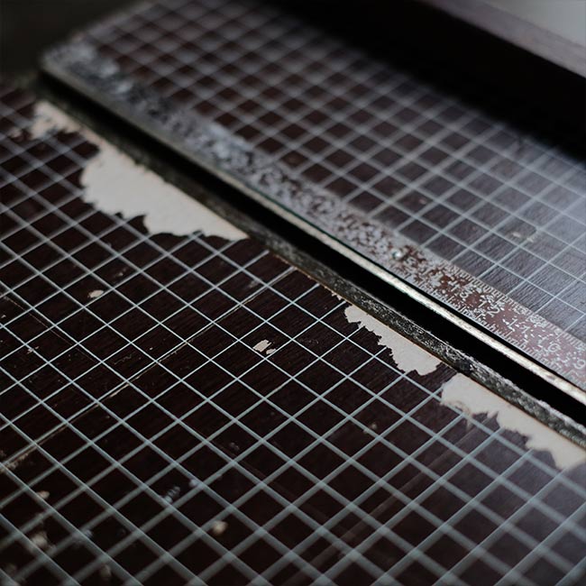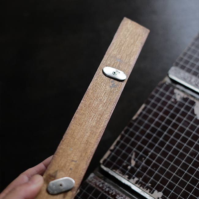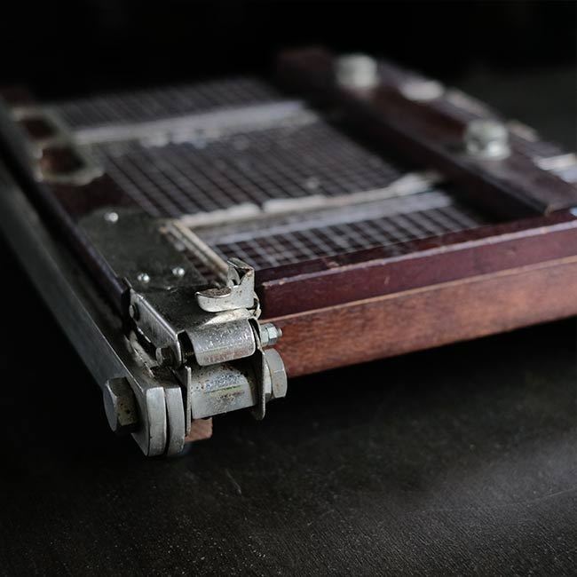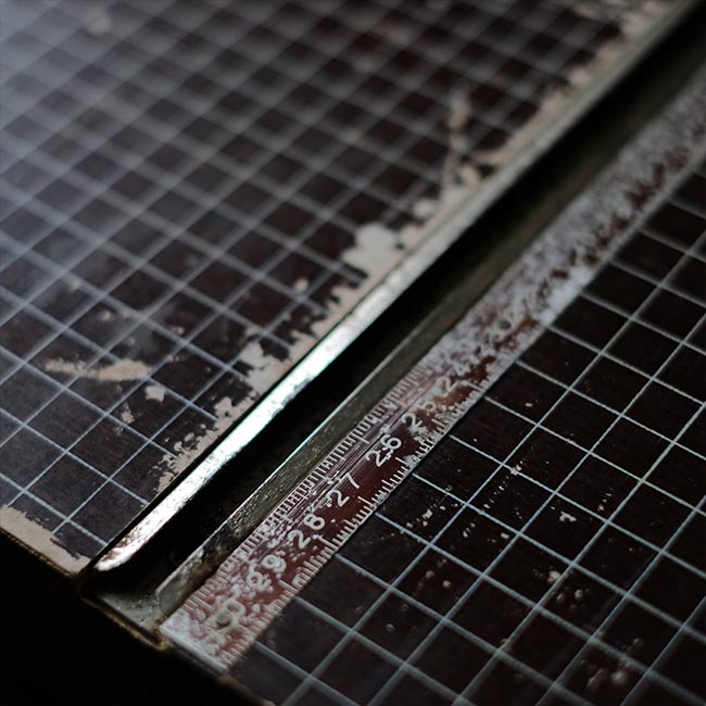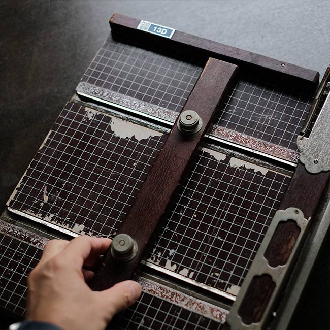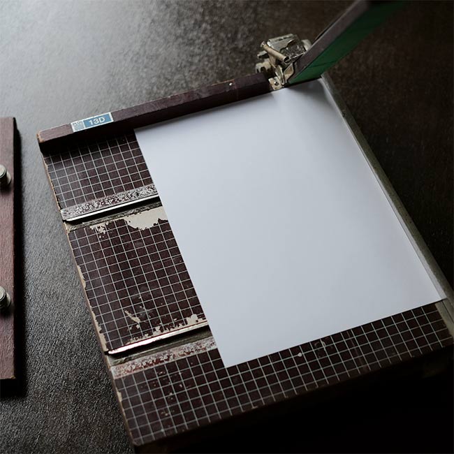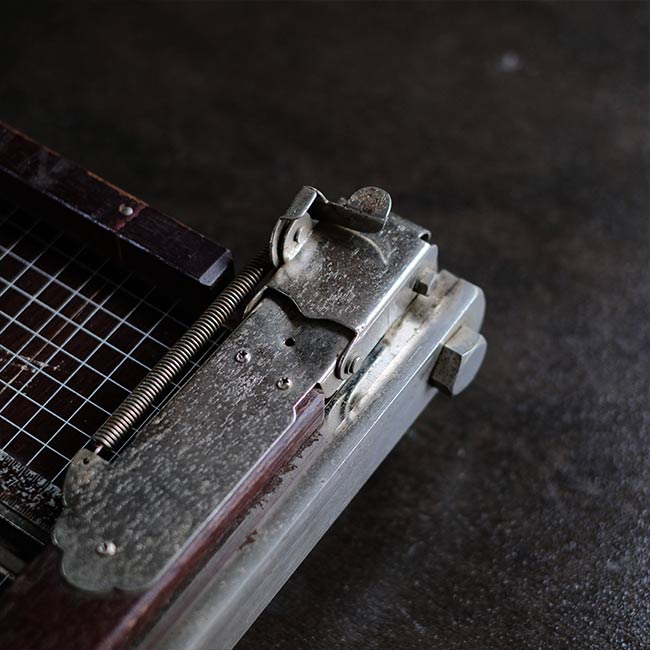 カッター脇には用紙のおさえと、反対側には可動式のバーも付属しており、使い勝手が考慮されています。サビやくすみ、部分的な塗装の剥がれが見られますが、クリーニングした上で、サビはある程度磨いて落としてあります。