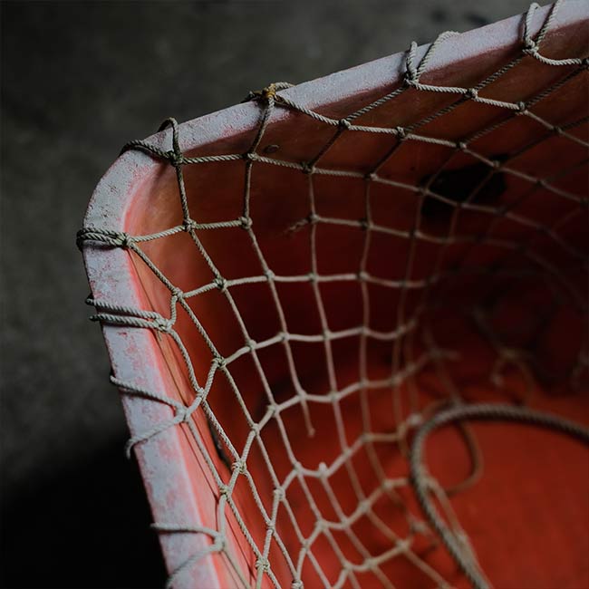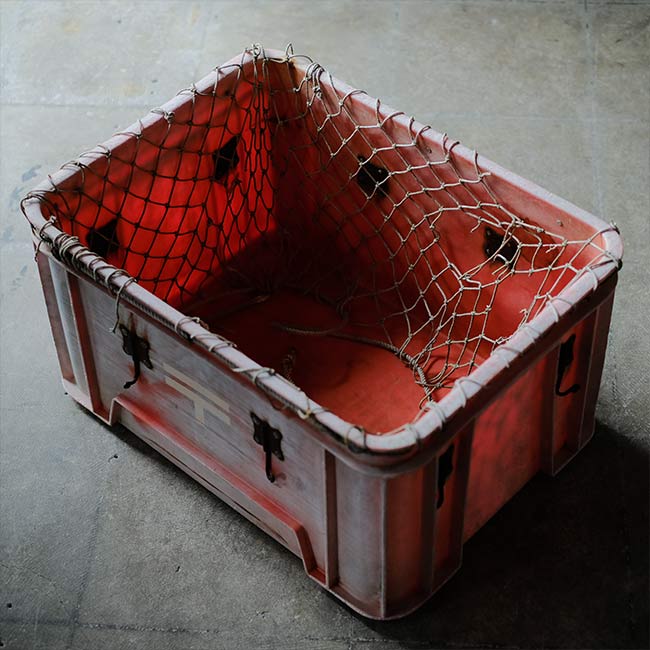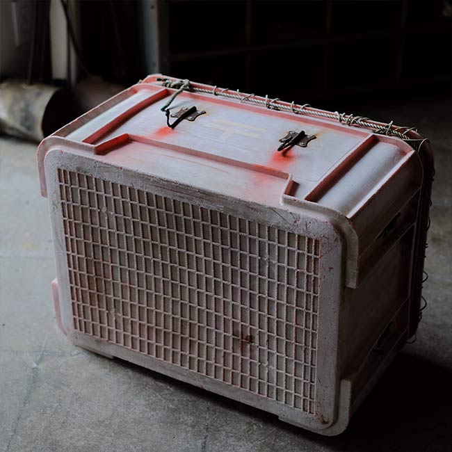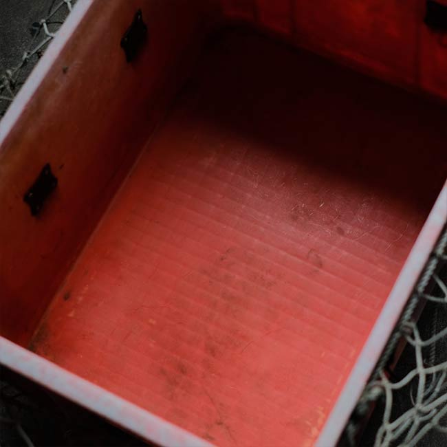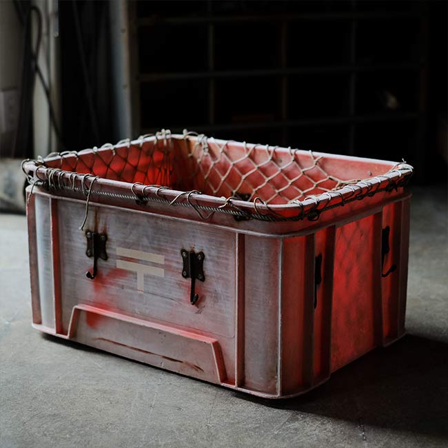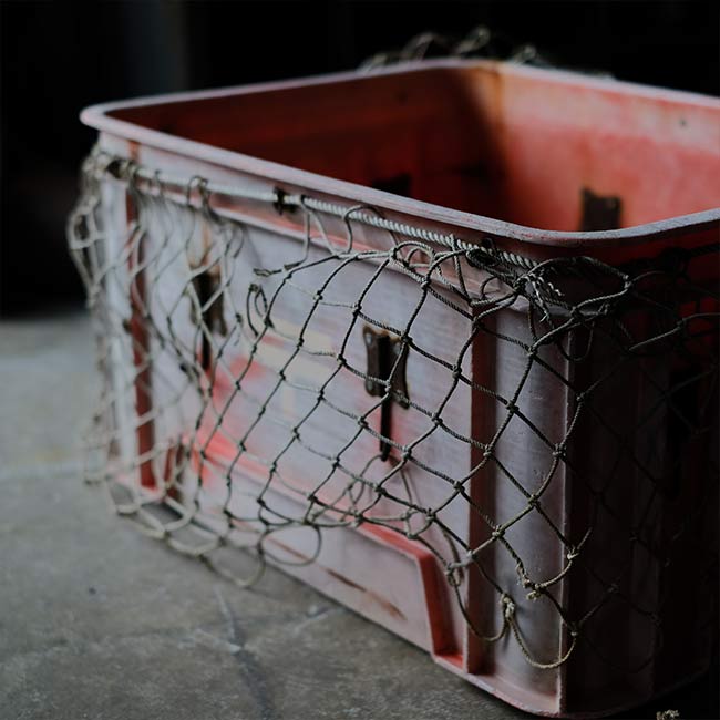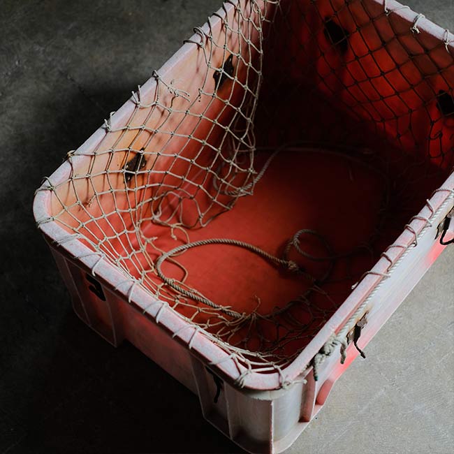 郵便物の運搬に使われていたプラスチック製のコンテナ。おそらくカブの荷台にくくり付けて使われていたものと思われますが、これほど色褪せたのも珍しいでしょう。ネットがまた泣かせます。ちなみに元の色は真っ赤です。大きさ的にはLPレコーとの収納によさそうなサイズ感。
