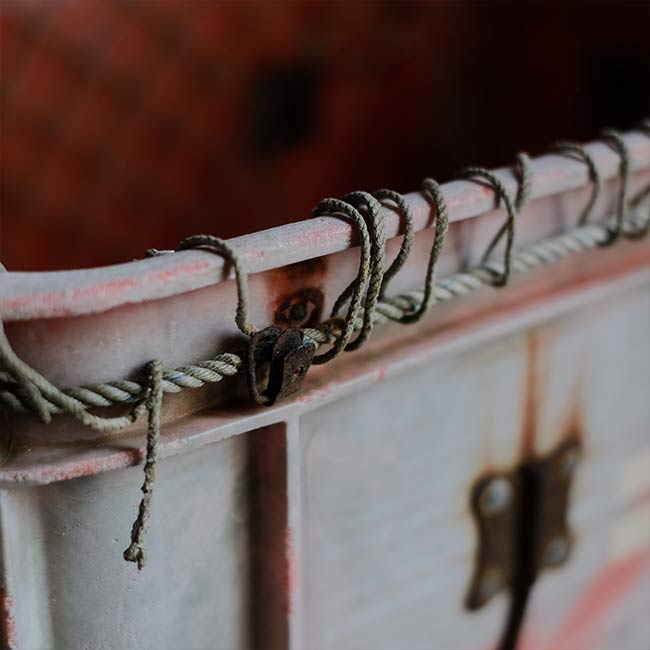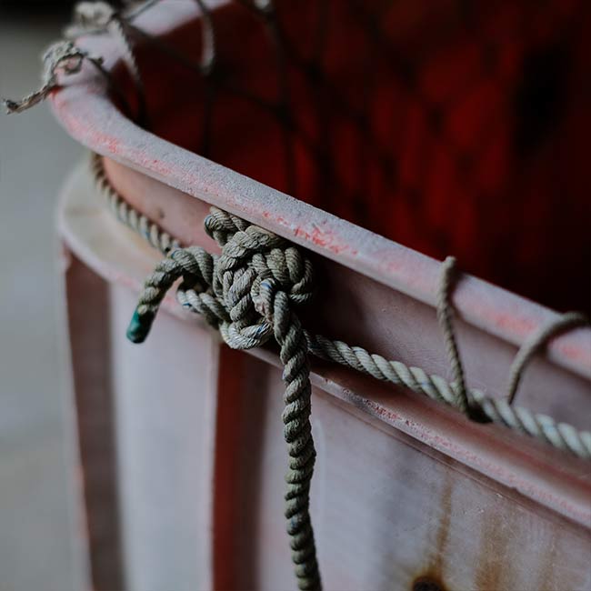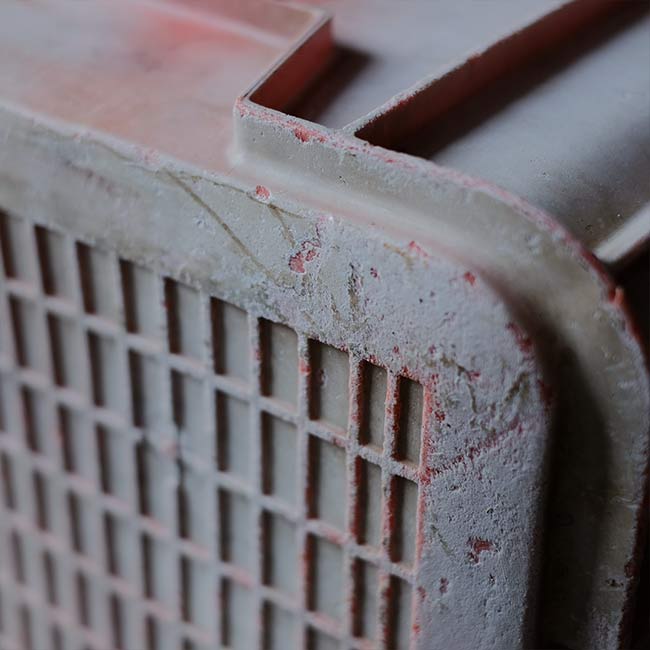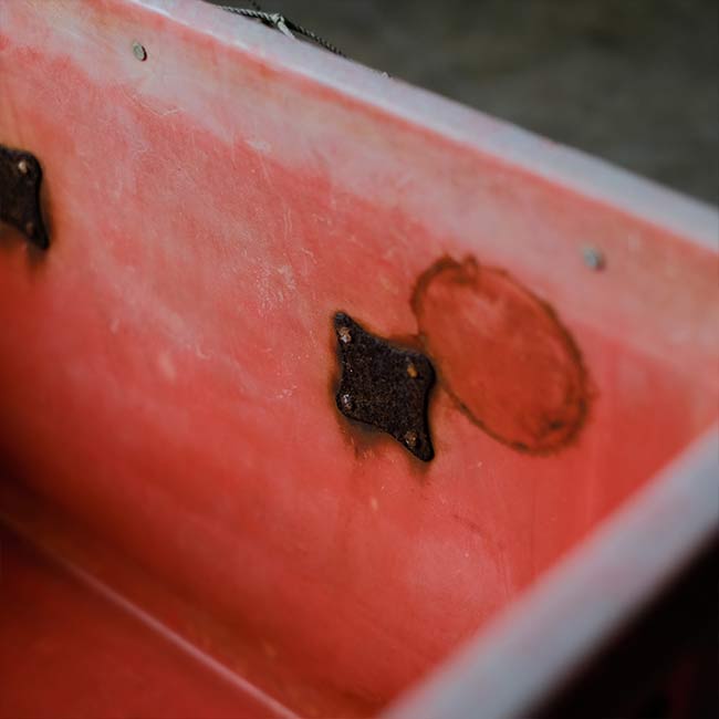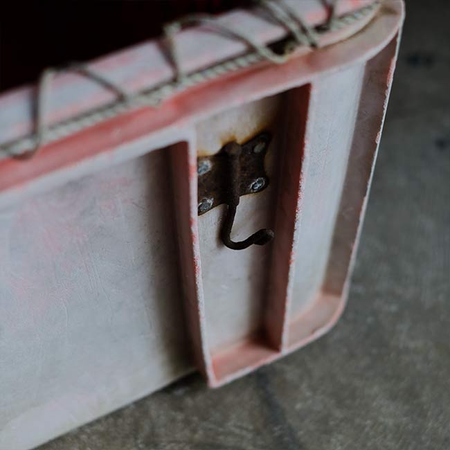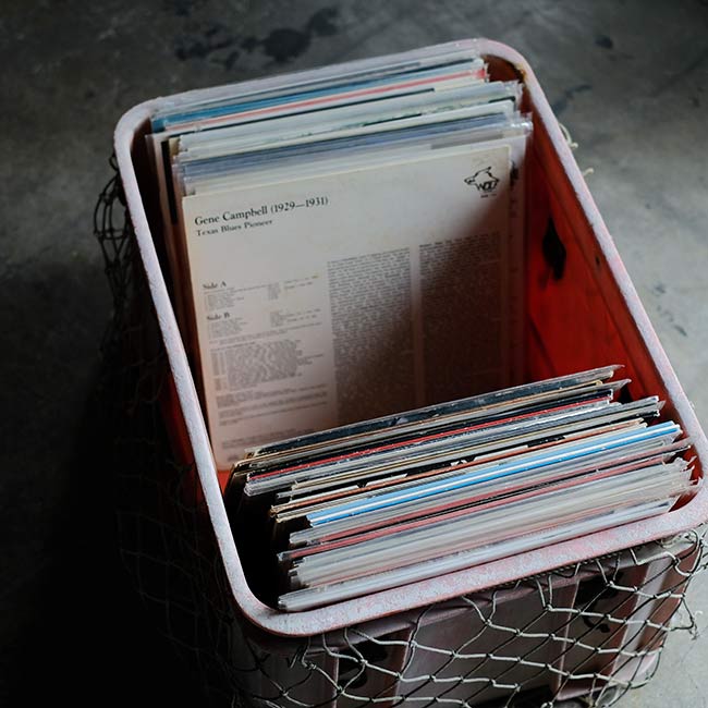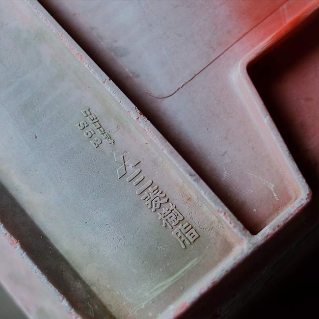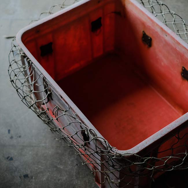 郵便物の運搬に使われていたプラスチック製のコンテナ。おそらくカブの荷台にくくり付けて使われていたものと思われますが、これほど色褪せたのも珍しいでしょう。ネットがまた泣かせます。ちなみに元の色は真っ赤です。大きさ的にはLPレコーとの収納によさそうなサイズ感。