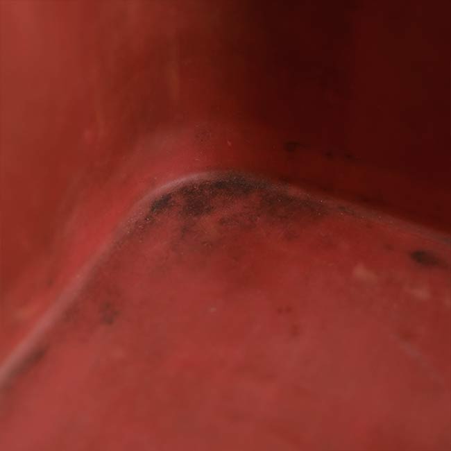 可能な限り入念にクリーニングしましたが、落とせないシミや薄汚れが残ります。また金具のサビや、底に一箇所小さな穴が見受けられます。なお表面が劣化していて細かいクズが出やすいため、外側はクリアスプレーを吹いておきましたが、まだ出るかと思われますので、何卒ご了承下さい。