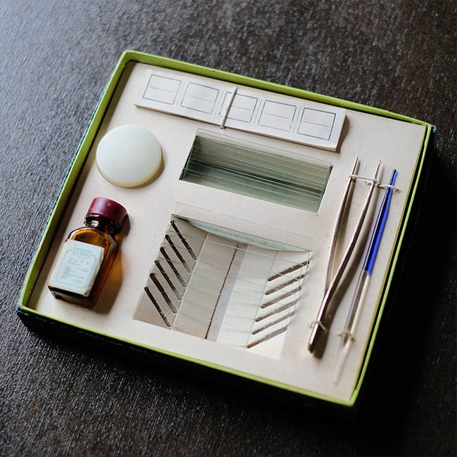 微生物などを顕微鏡で観察するためのプレパラートのセットになります。ケースにシミ等が残りますが、未使用品で、ガラスもキレイな状態です。セット内容は下記の通りです。