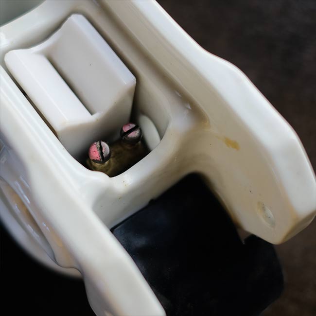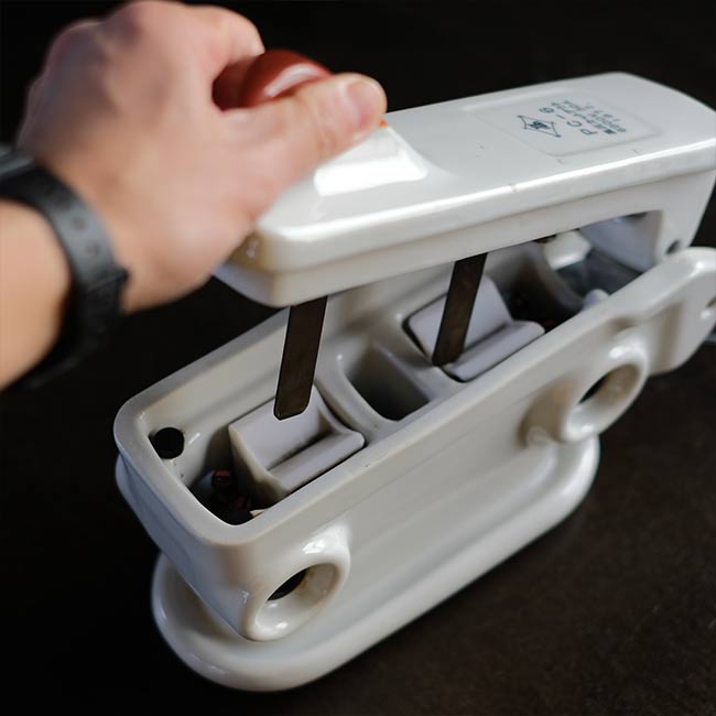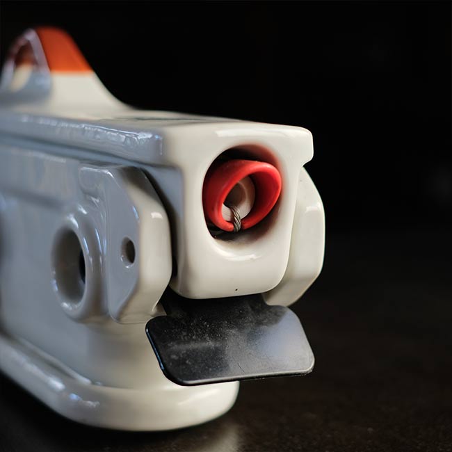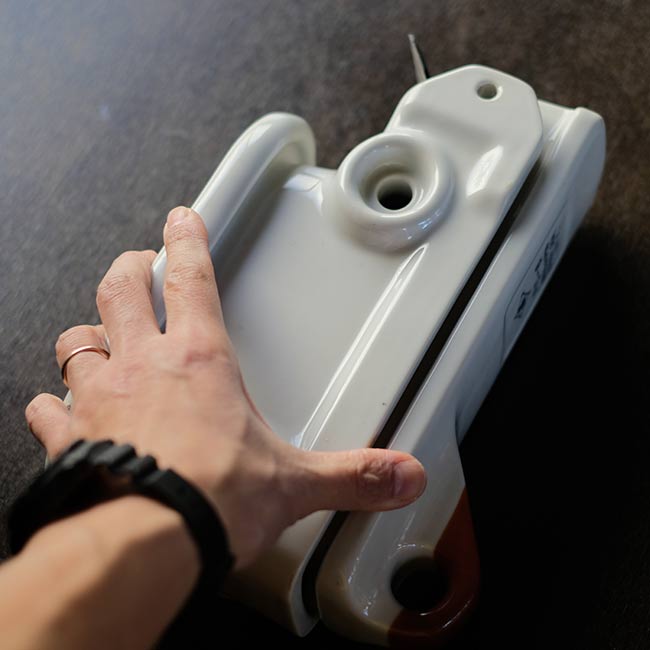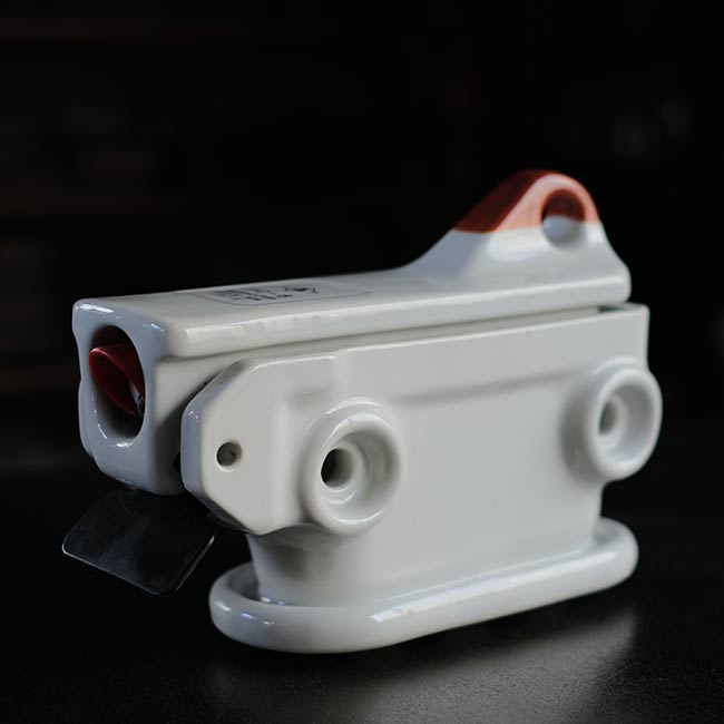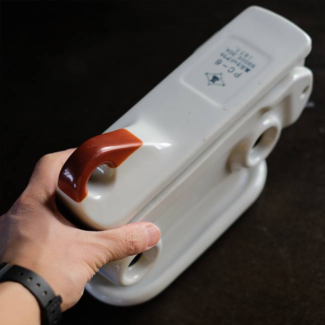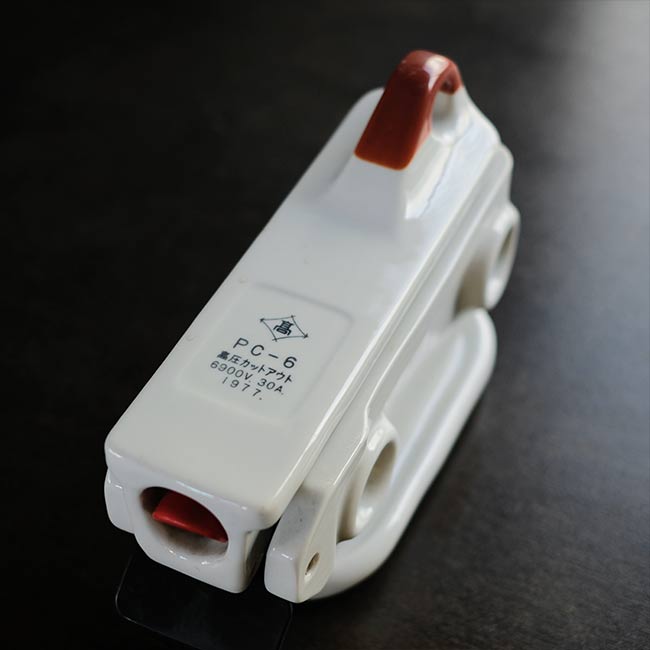 配電路の開閉や過負荷の保護に使われる装置で、電柱などの受電設備に設置される磁器製のケースになります。ケースと言っても見た目は磁器の塊で、重さは4キロを超えます。