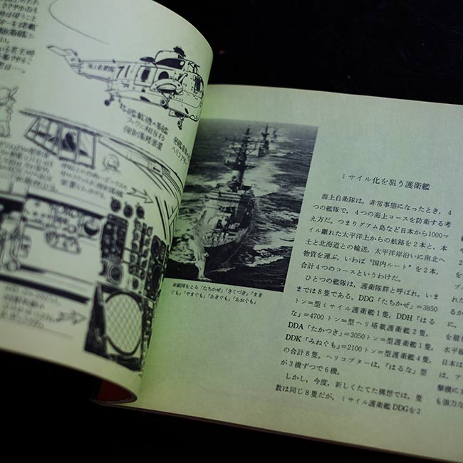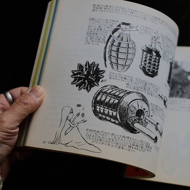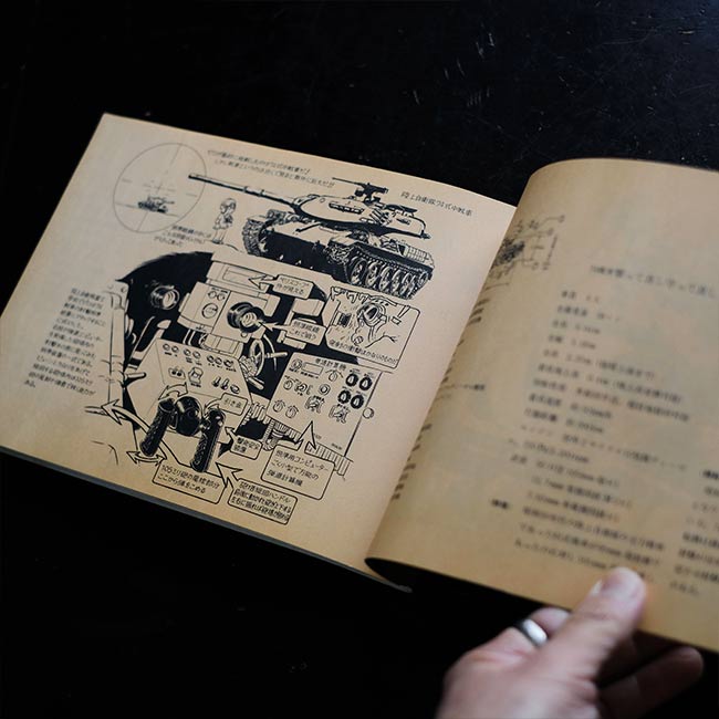 戦車、戦闘機、戦艦、武器、ヘルメット等、様々なメカをジャンルごとに分けて、イラスト+解説という組み合わせで紹介。イラスト脇の解説はすべて手書きとなっております。