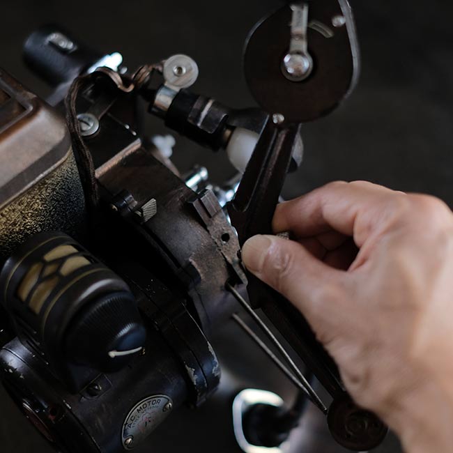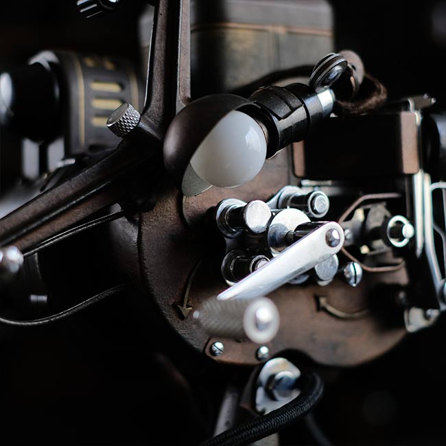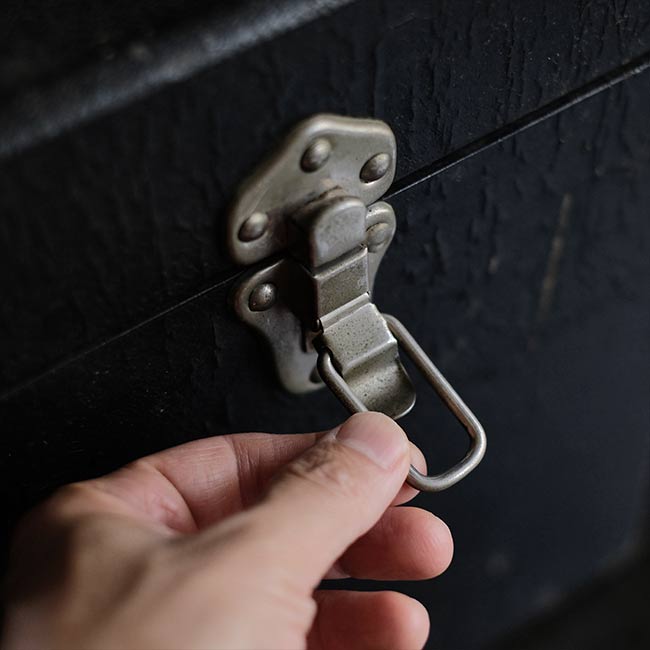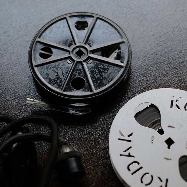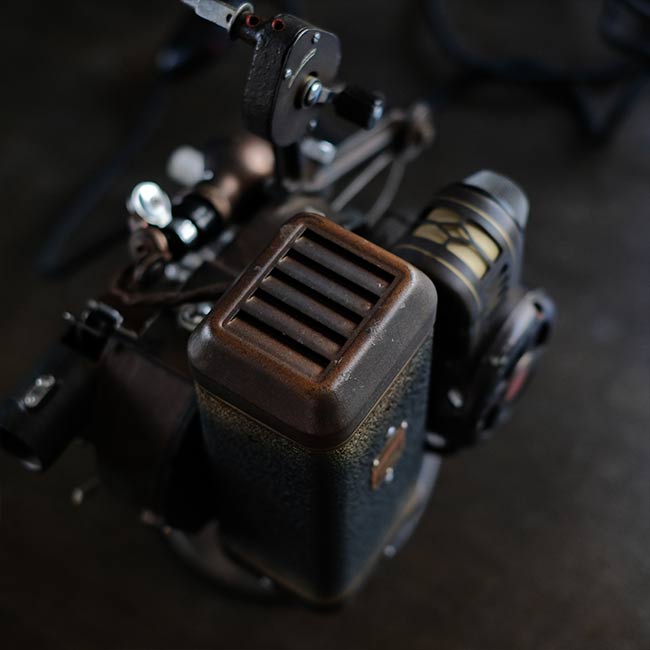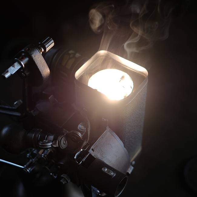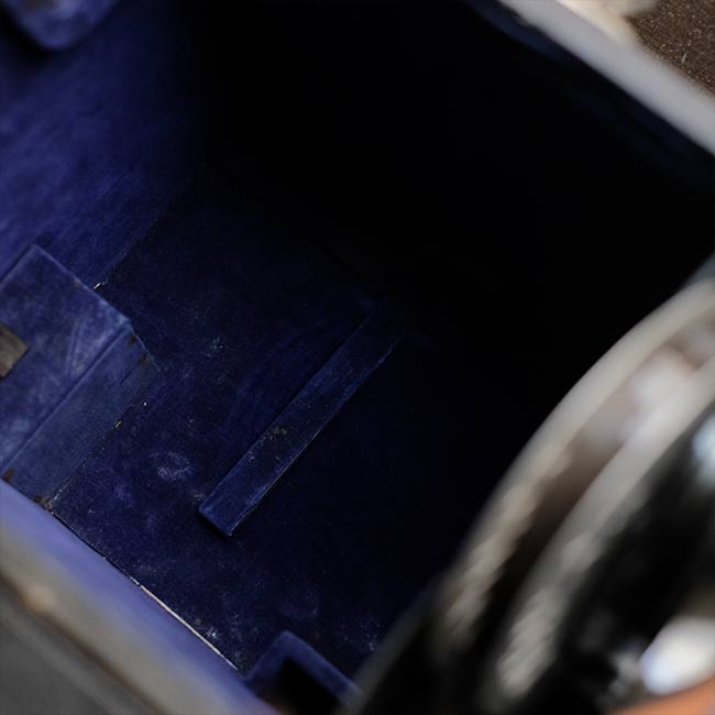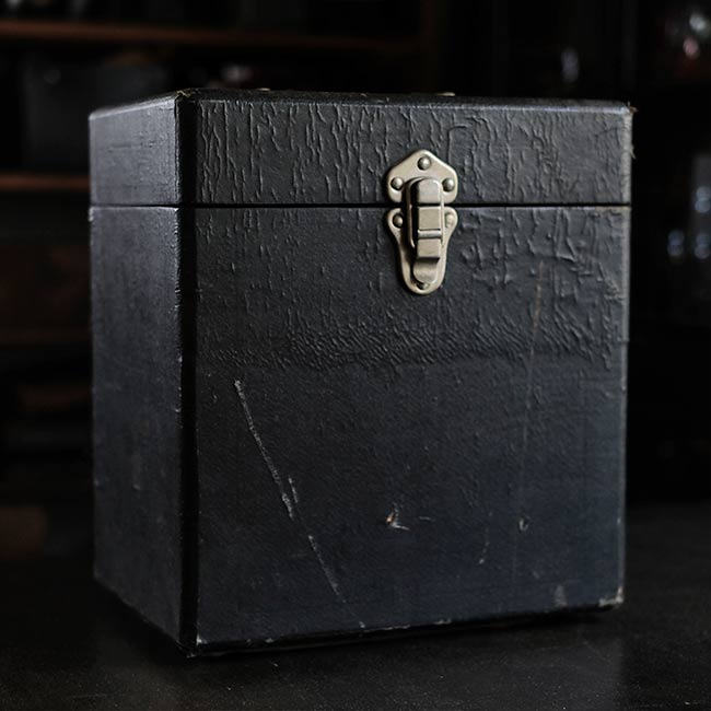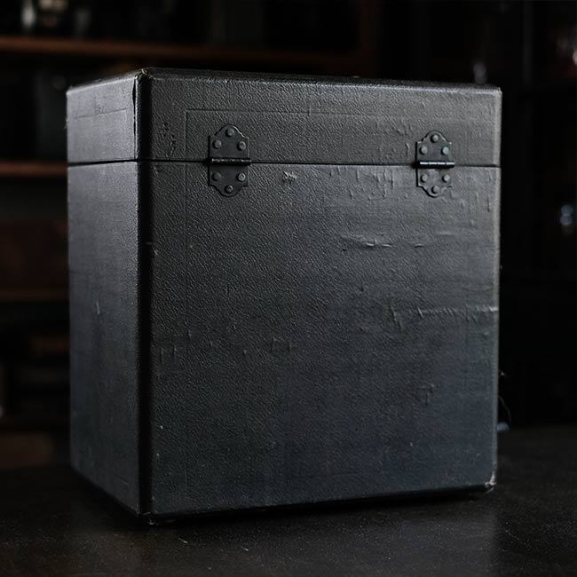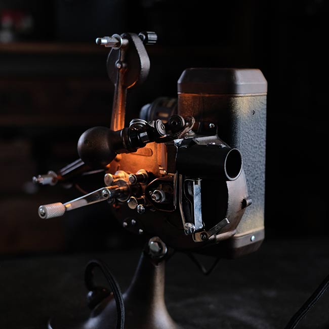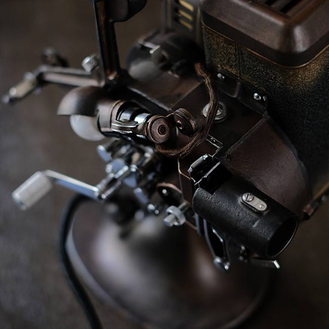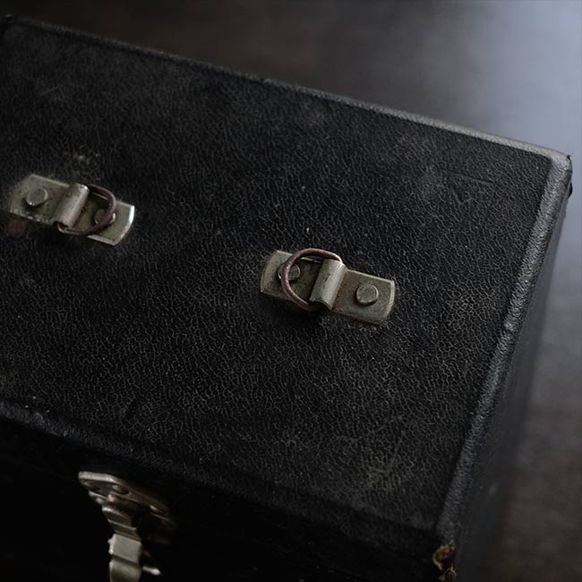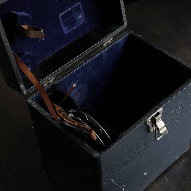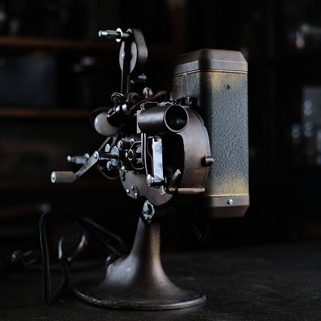 可能な限りクリーニングしてみましたが、映写機本体の黒ずみや塗装の剥がれ、コードのダメージ、ケースの傷や薄汚れといったダメージが残ります。なおケースの革製のハンドルは外れていますが、残っております。