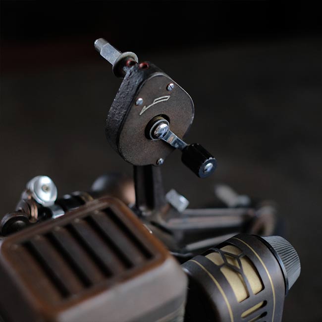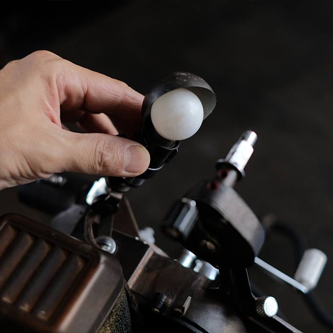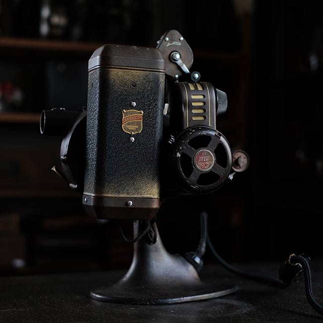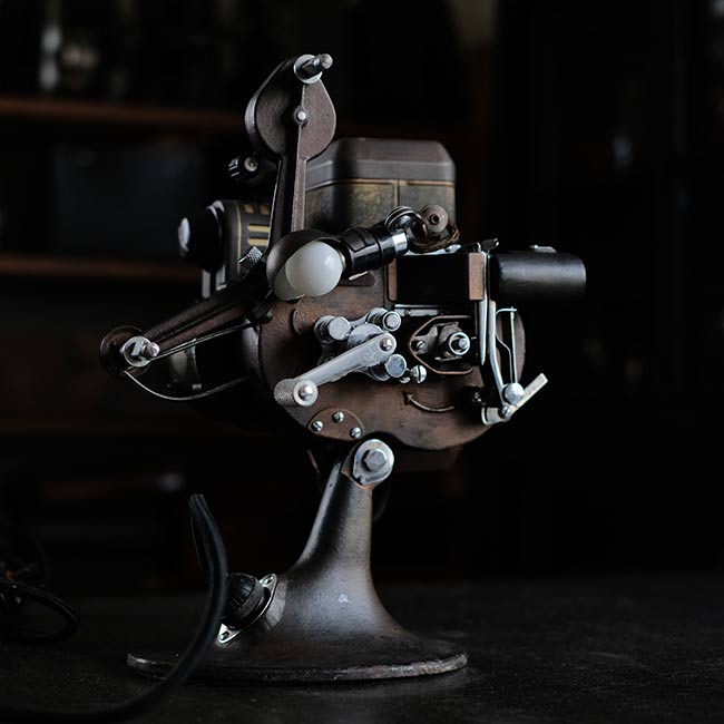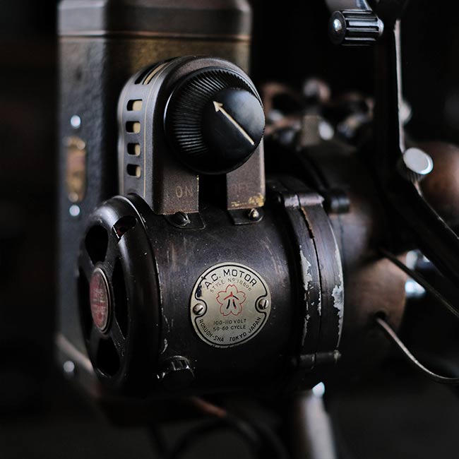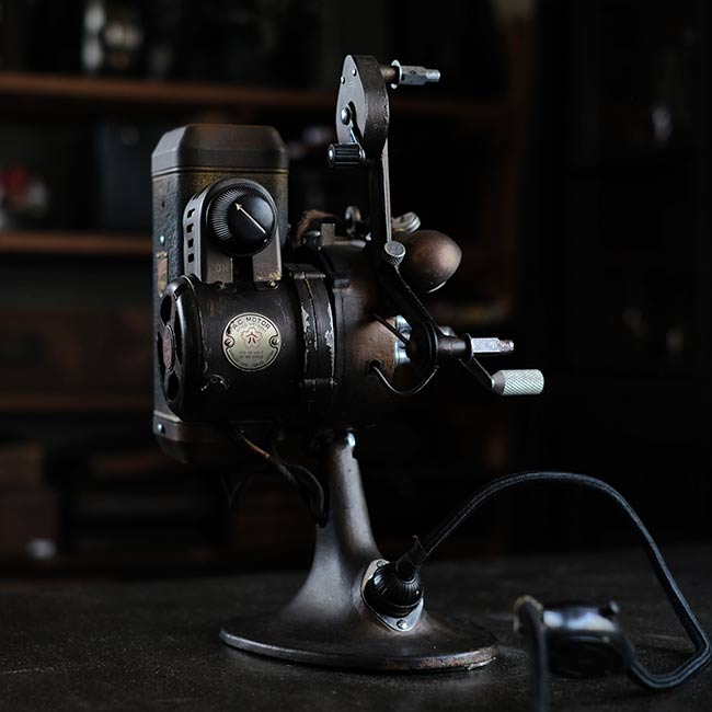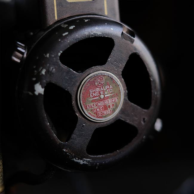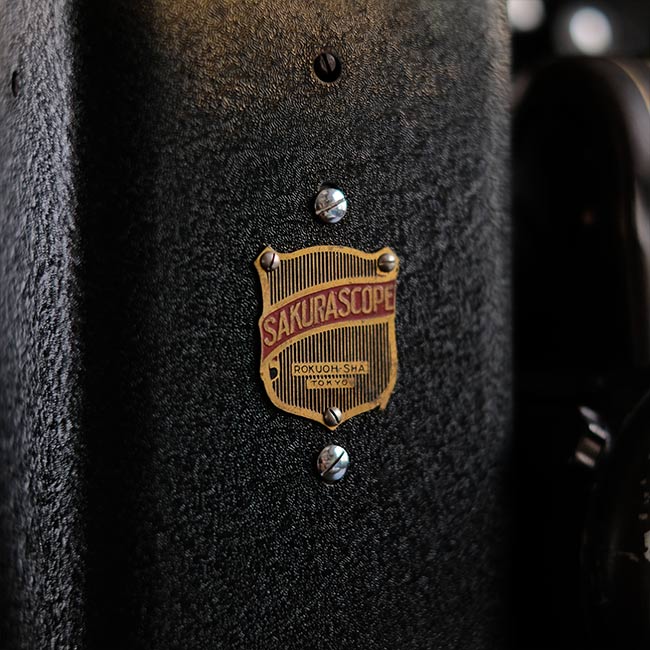 1930年代のものと思われる六桜社の映写機。六桜社はコニカミノルタの前身となる小西屋六兵衛店が、写真乾板や印画紙の製造工場として建てた工場ですが、映像用のフィルムなども手掛けていたそうです。なおモーターの外側の赤いプレートに「SHIBAURA ENG」の文字が入ってるので、部分的に外注していたのでしょう。