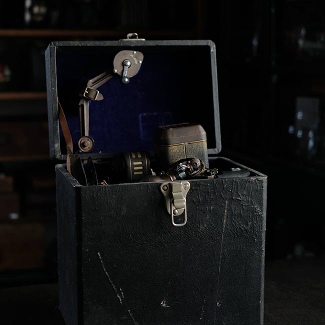専用のケース、ハンドル、コンセント、フィルム、オイル差しが付属。ハンドルは取り外しが可能です。なお、おそらくレンズも付いていたはずですが、残っていませんでした。