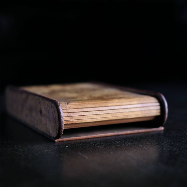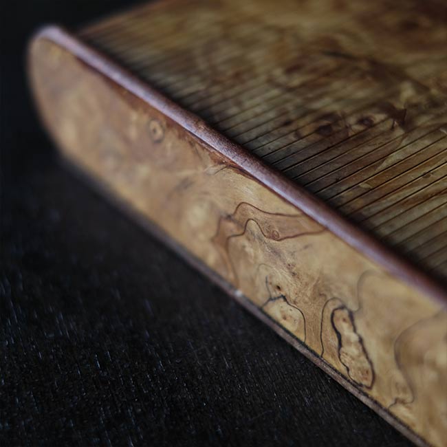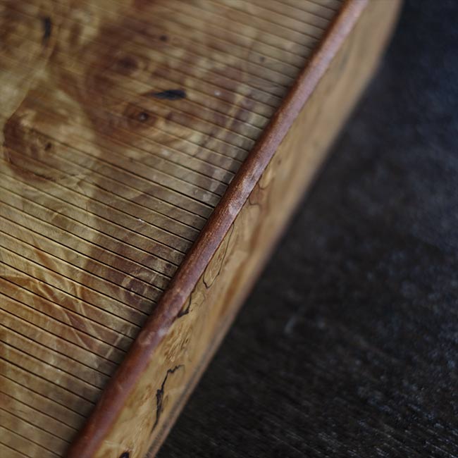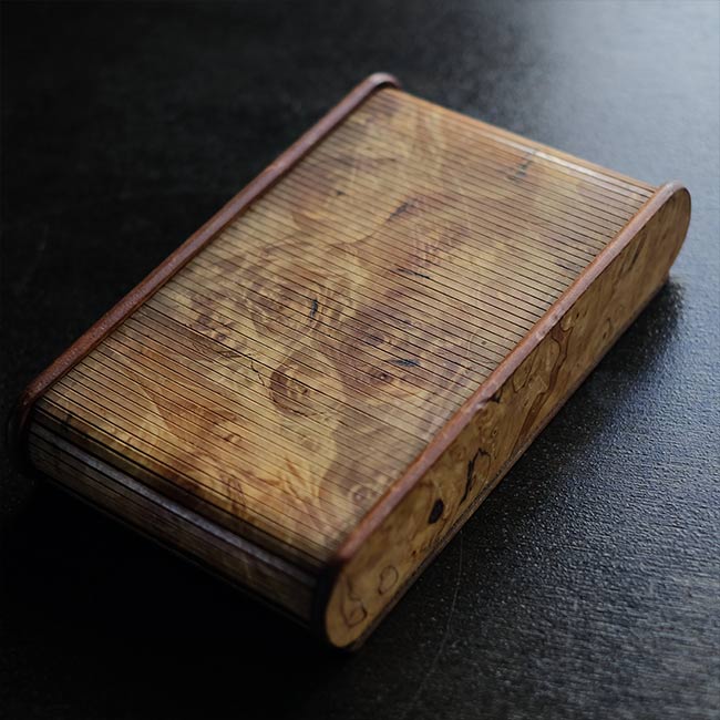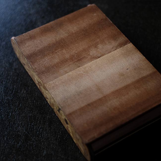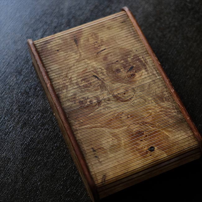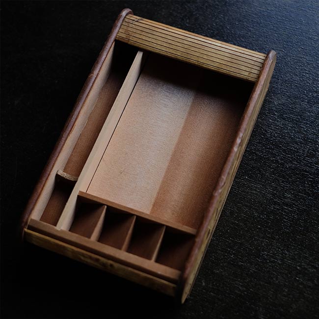 スライド式の蛇腹の蓋が付いた小物入れになります。インク壺付きの文箱のようなものは古道具としてたまに仕入れることがありますが、このデザインは初めて見ました。木目も非常にキレイです。